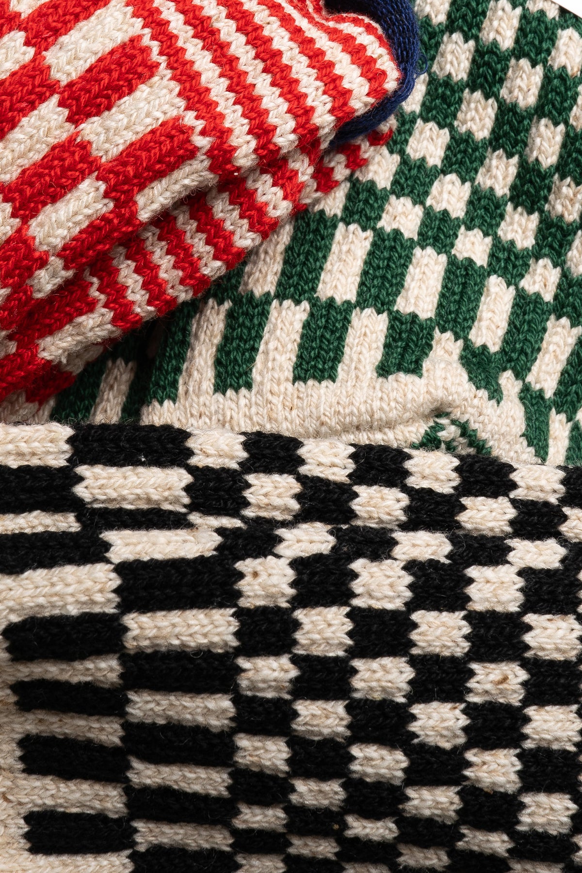 Checkerboard-patterned socks with a moderate thickness for everyday comfort. Knitted using a jacquard technique that minimizes loose yarns on the inside, reducing bulk and ensuring a smooth, comfortable fit.