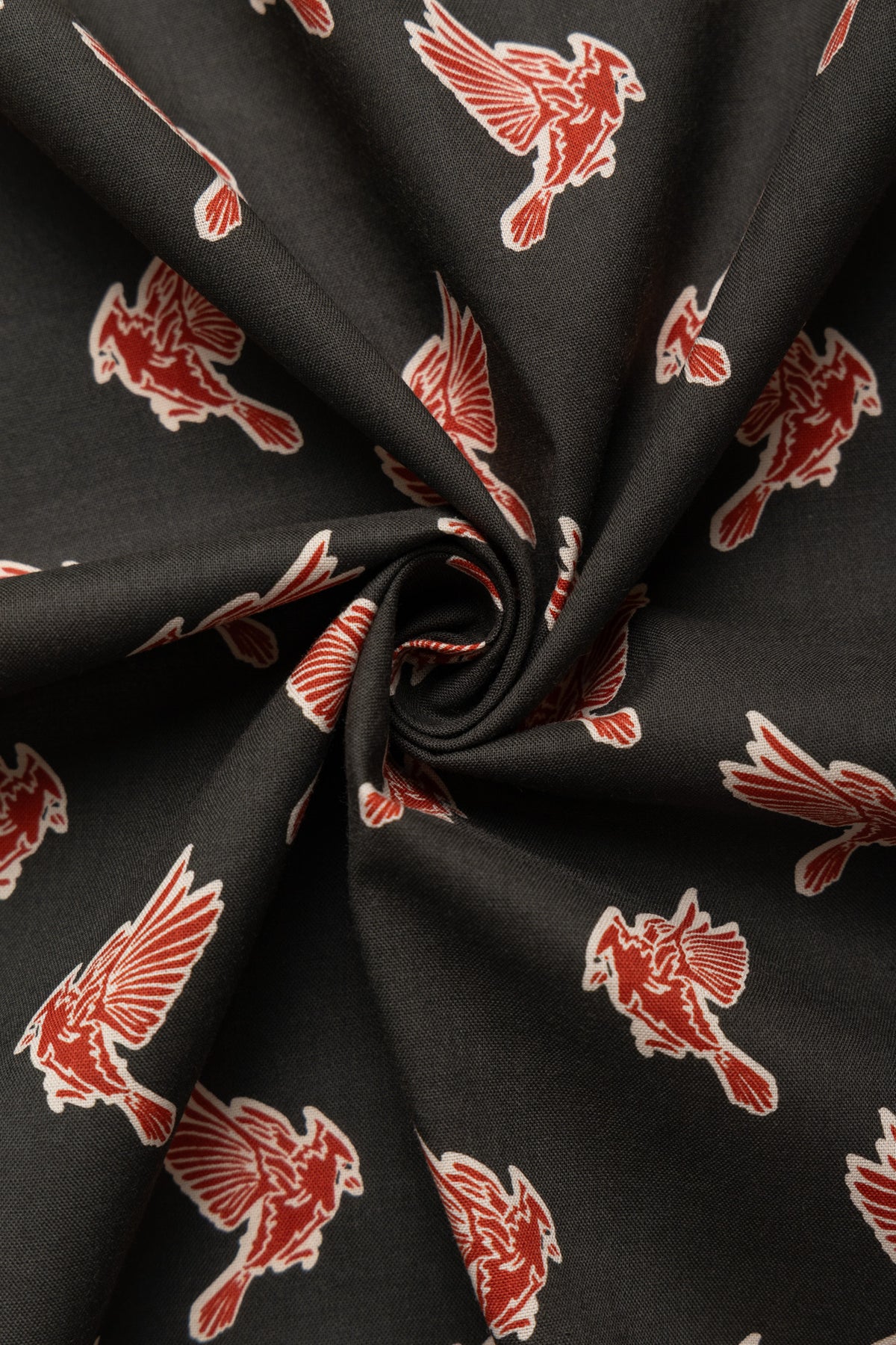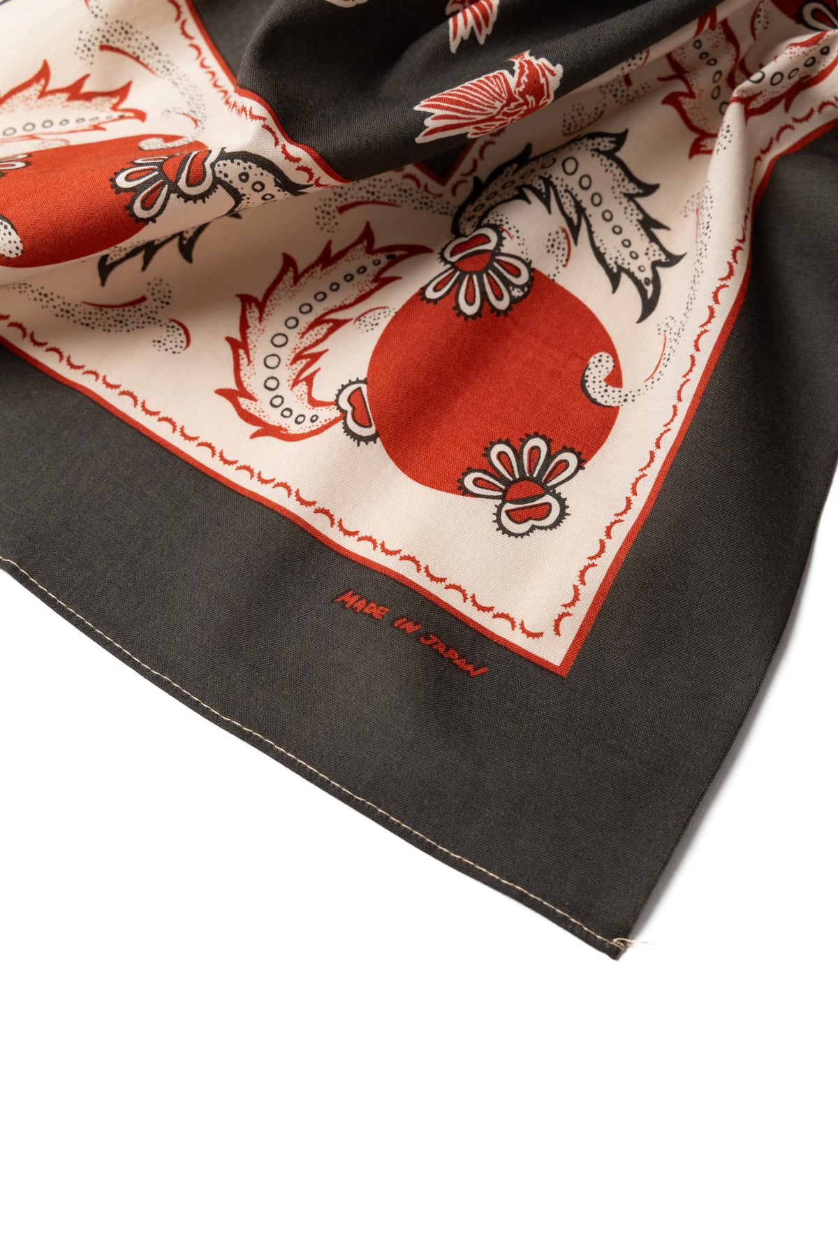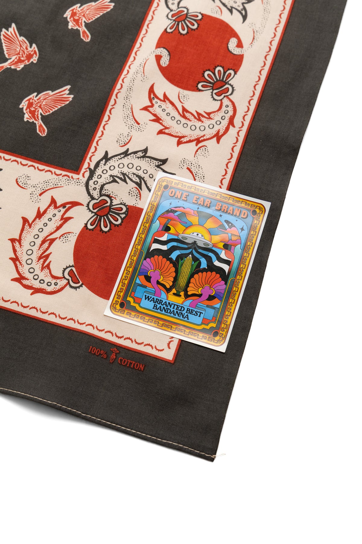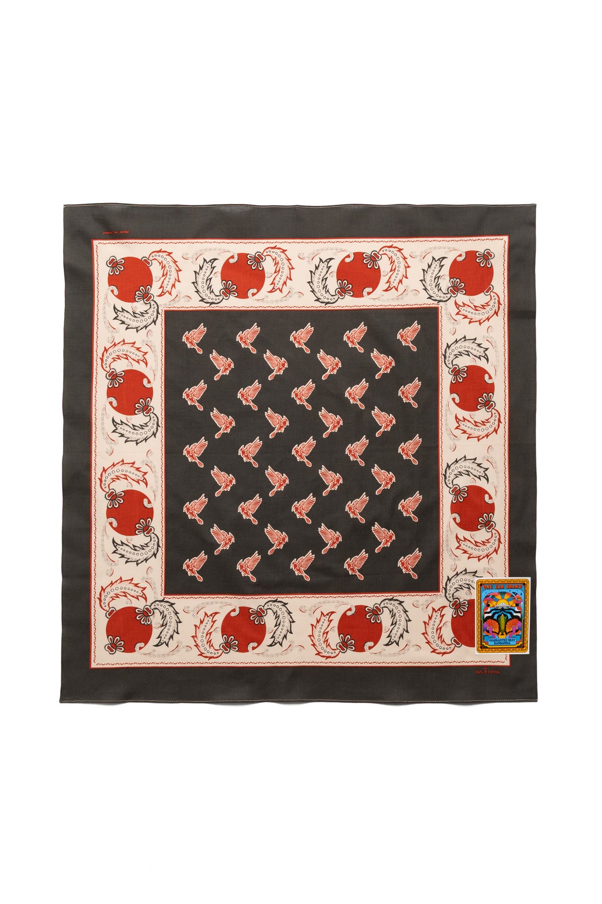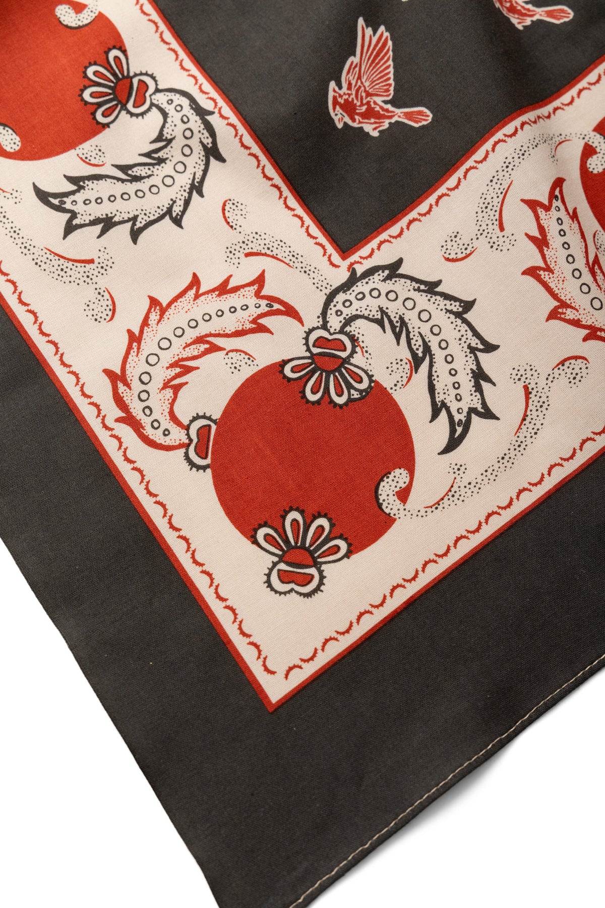 This design was inspired by a turkey red bandanna. This era of bandannas is always very interesting detail-wise. The original had a bird motif in the middle and these little feather ornaments on the outside. One Ear Brand wanted to change the center motif to something more easily recognizable -cardinals. Entirely redrawn from the original, all the details have been changed and everything is original. They were listening to baroque lute music and this design really meshed well with it. Consider this design a sort of modern antique. They don’t do many black bandannas, but this one is an interesting Japanese hue of black. “Sumi” is a lovely softer black that really looks nice next to deep reds and antique whites.