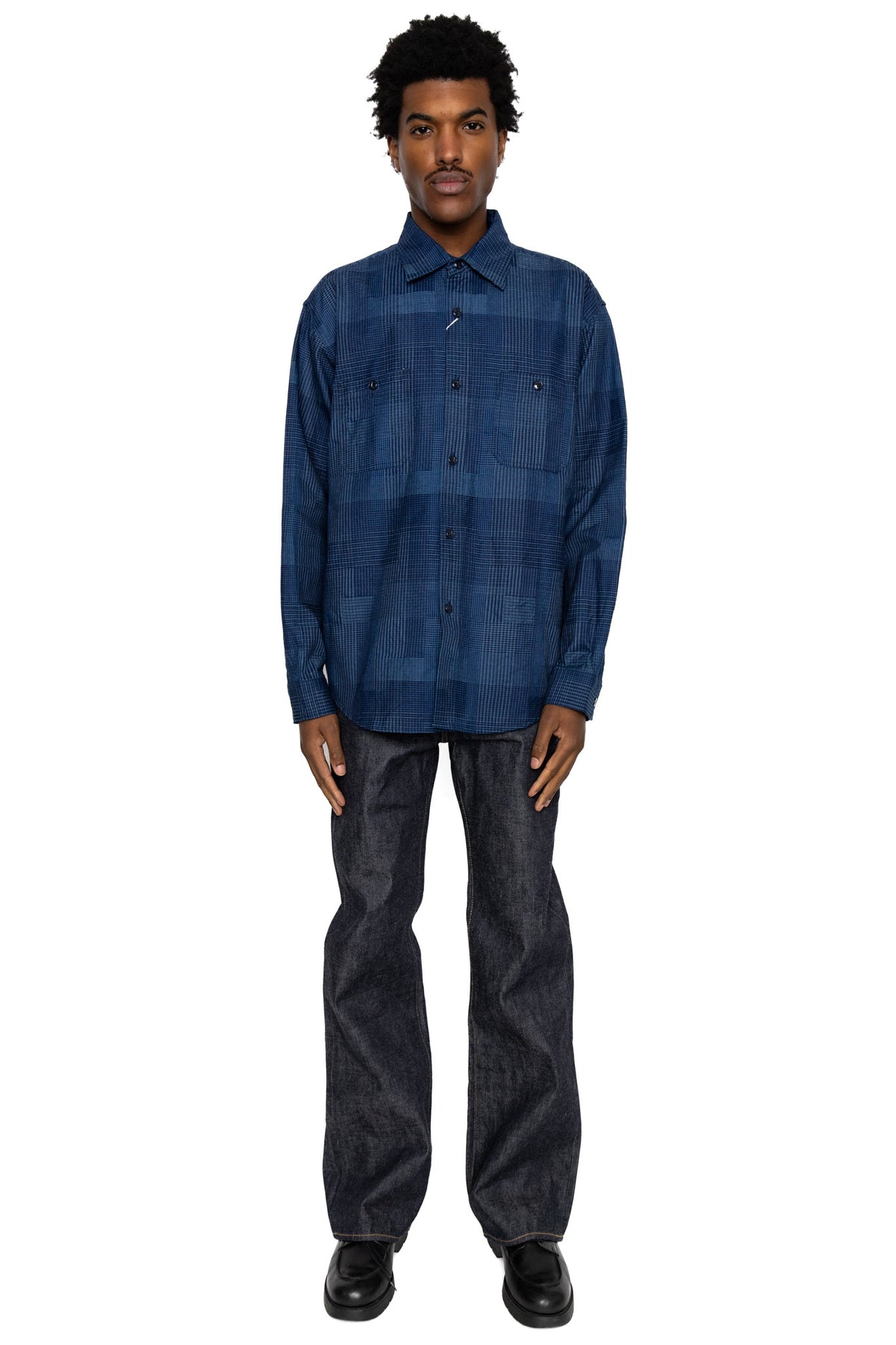 Made with indigo-dyed patchwork-style fabric, reminiscent of vintage fabric.
