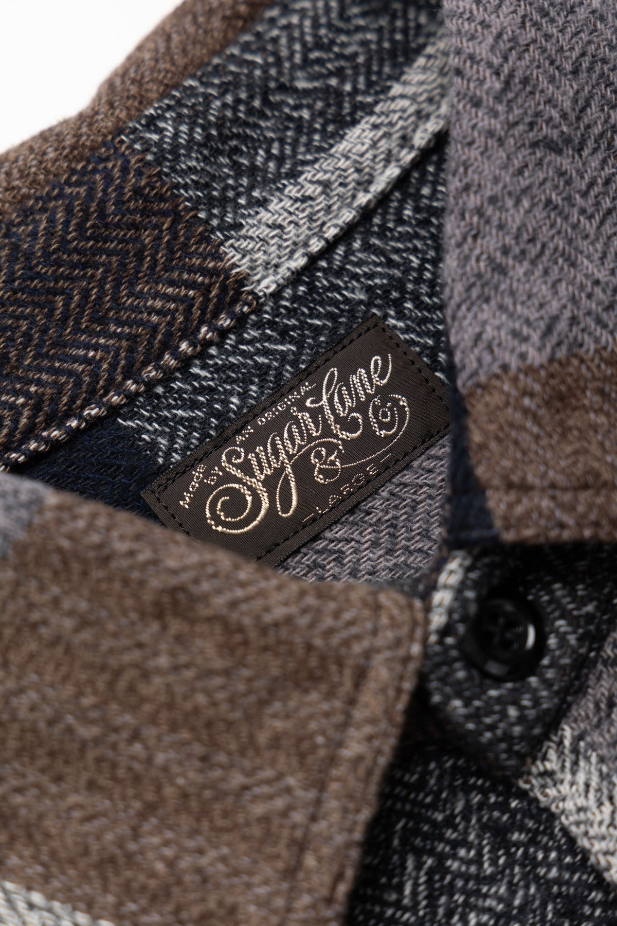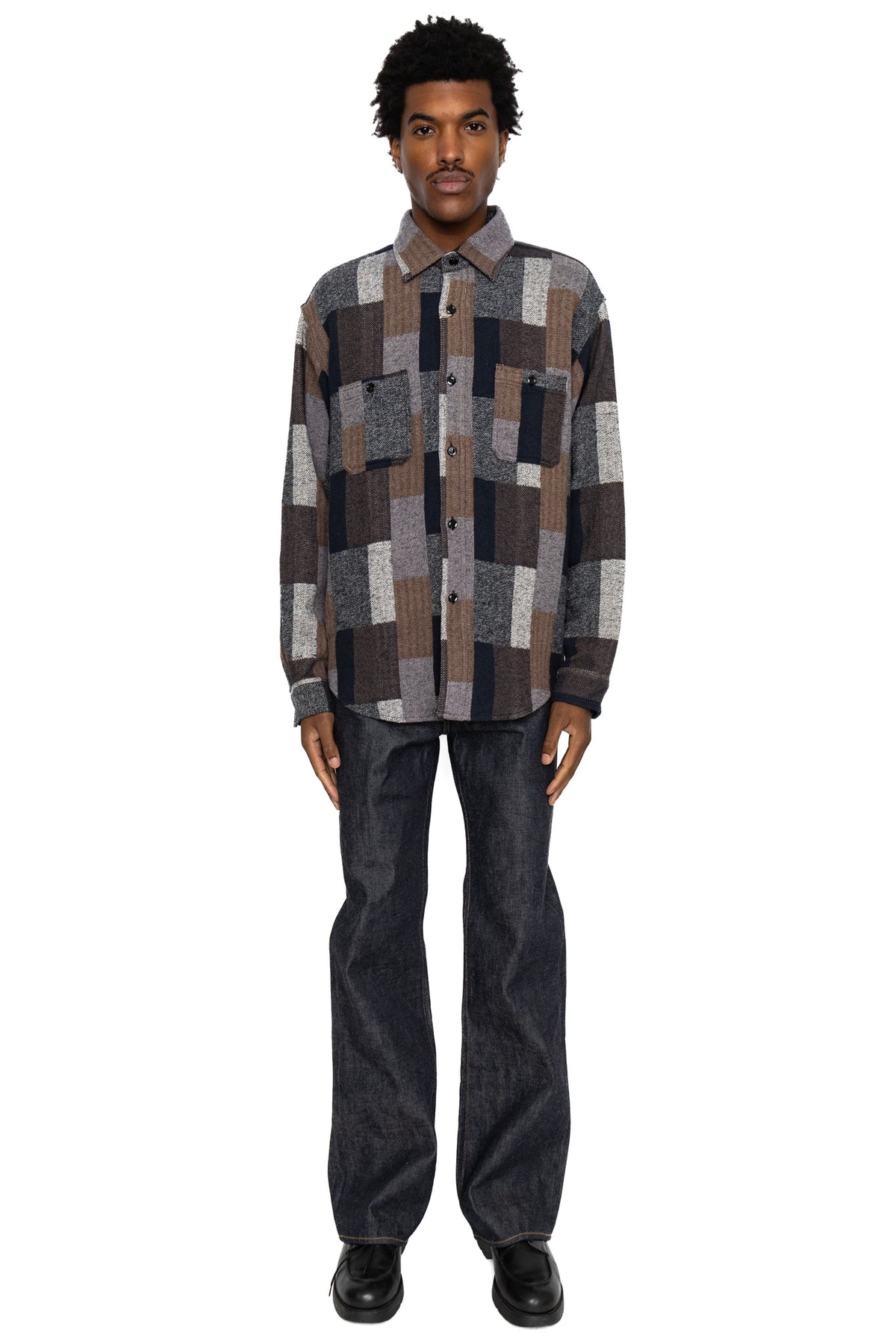 A work shirt made in a patchwork style by double weaving instead of sewing check fabrics together