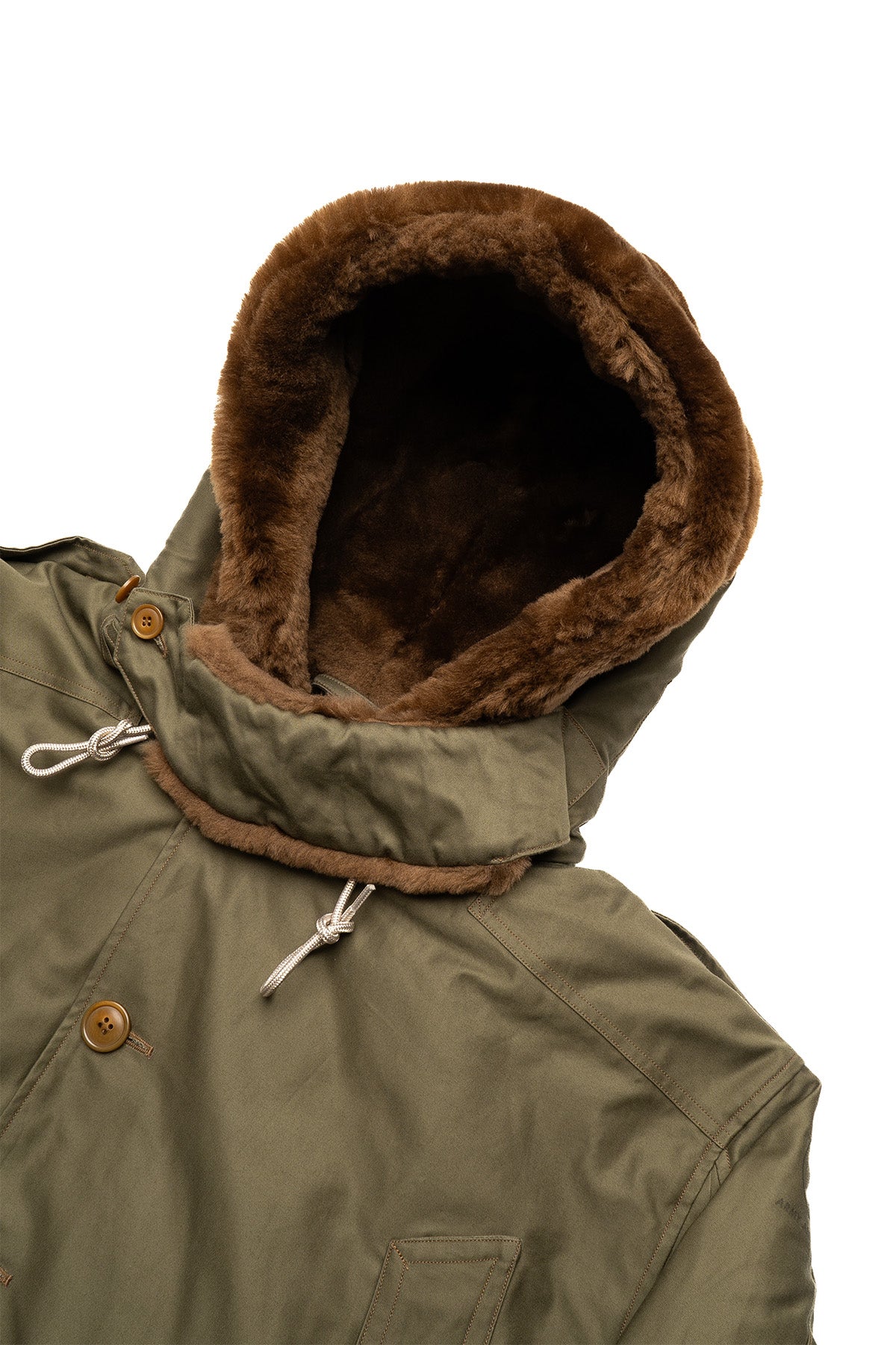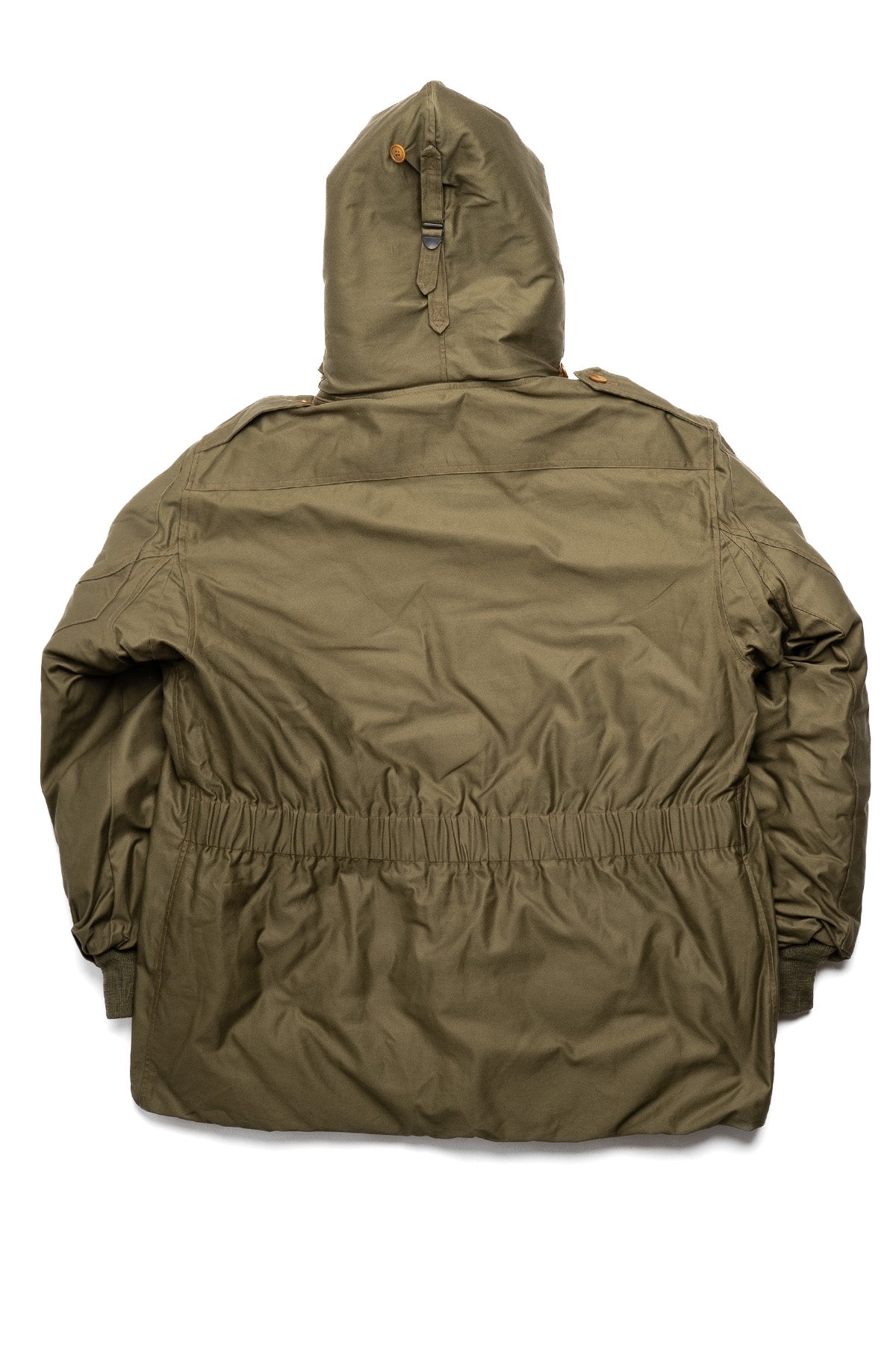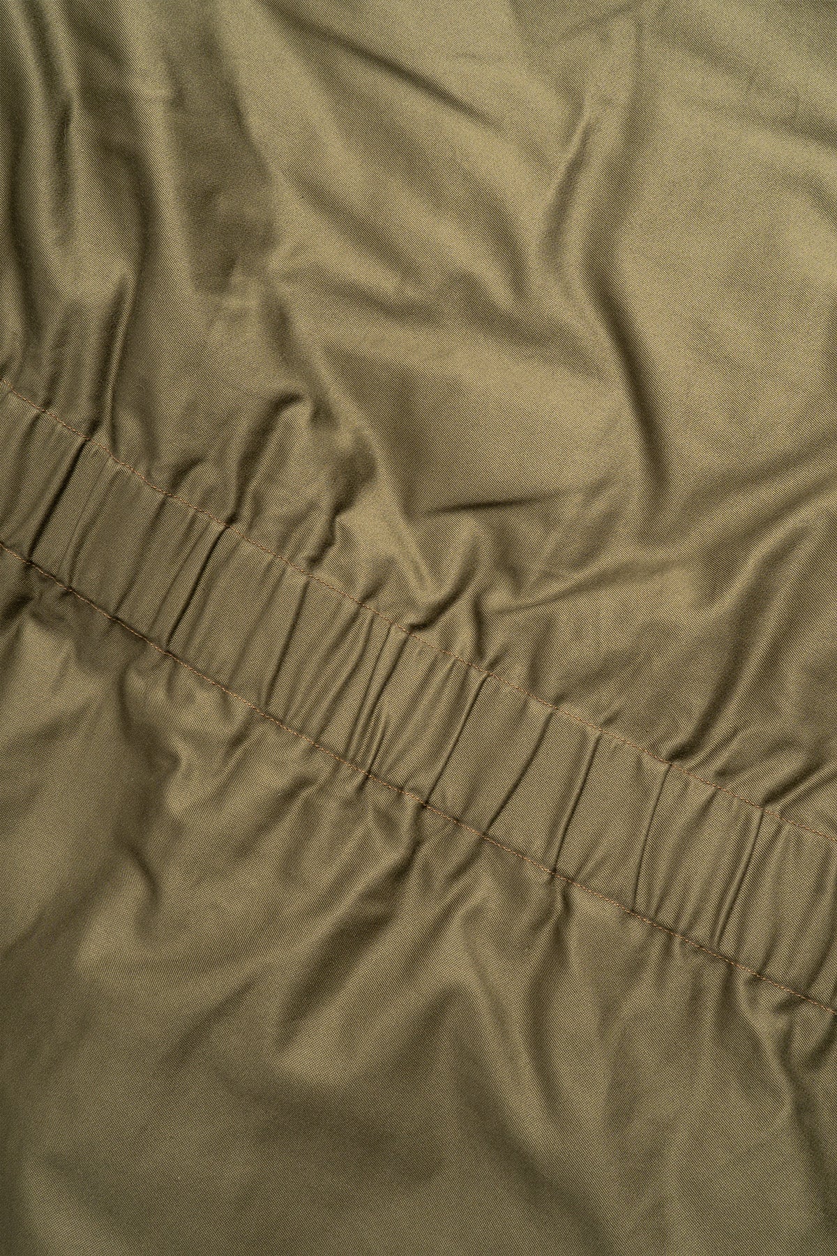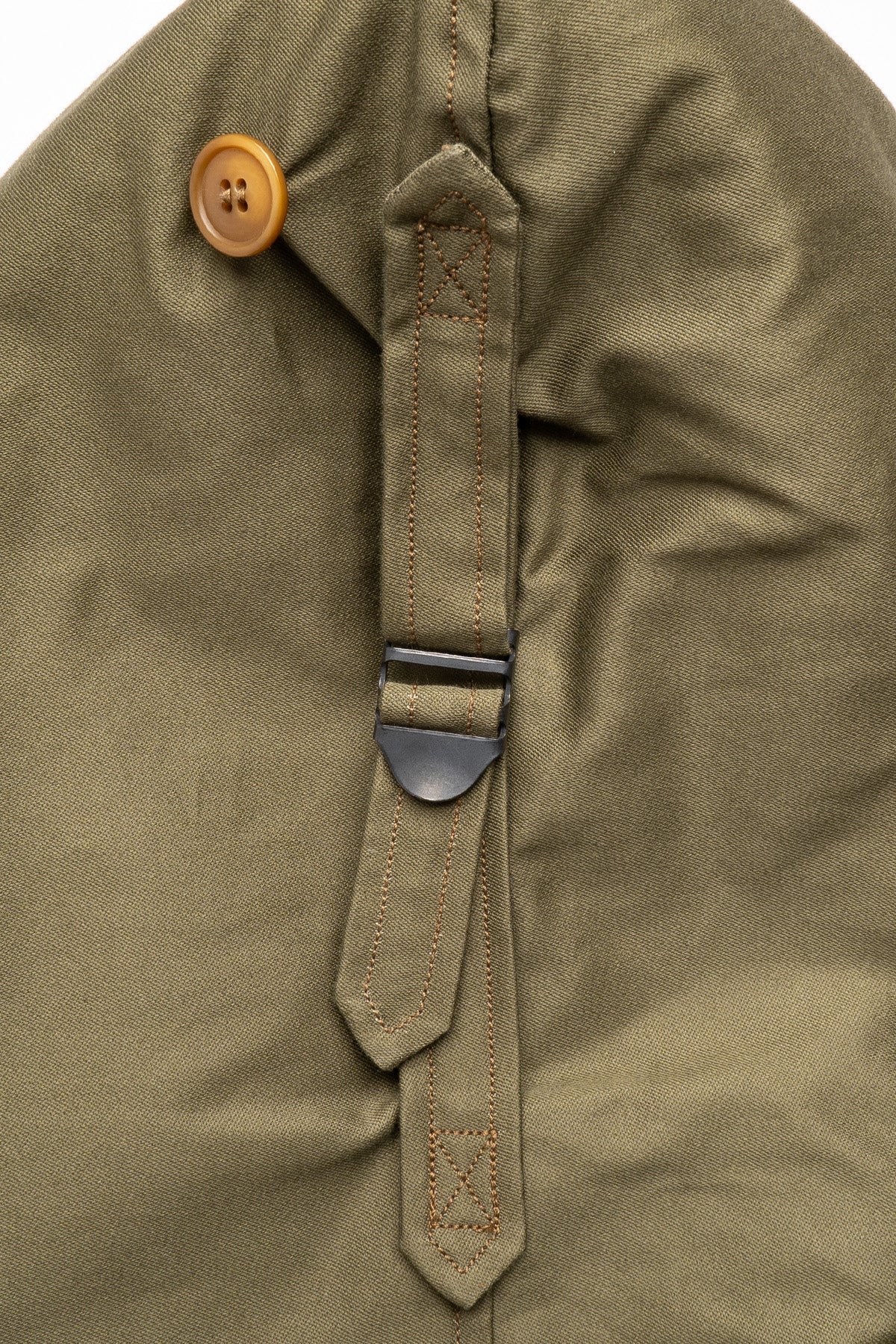 This parka features a multi-layer construction consisting of an outer shell and a down-filled lining. The outer shell is made from 100% cotton soft twill fabric in olive drab. The lining is crafted from 100% cupro satin quilted fabric, filled with 90% down and 10% feathers, providing exceptional warmth and a smooth, comfortable feel.