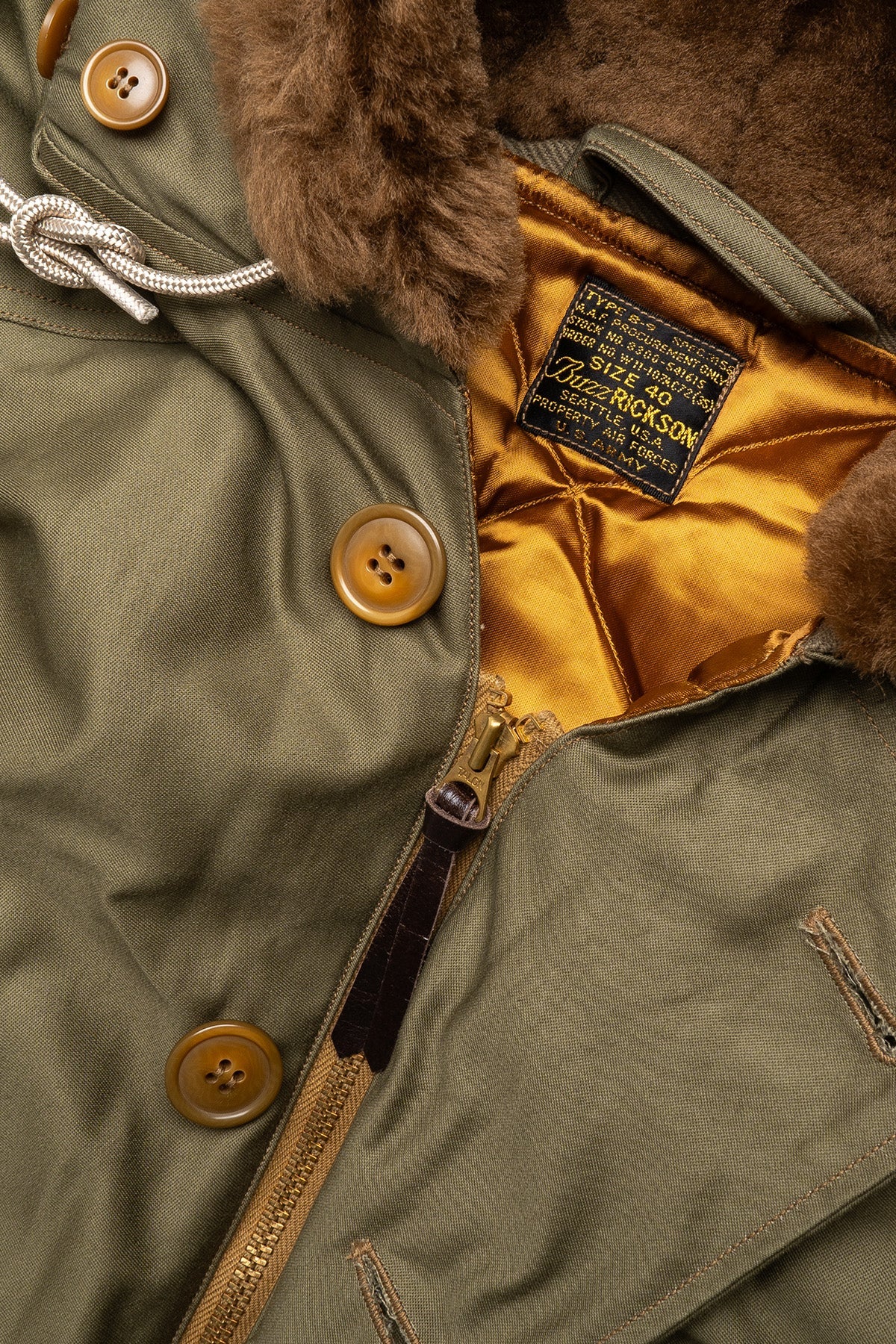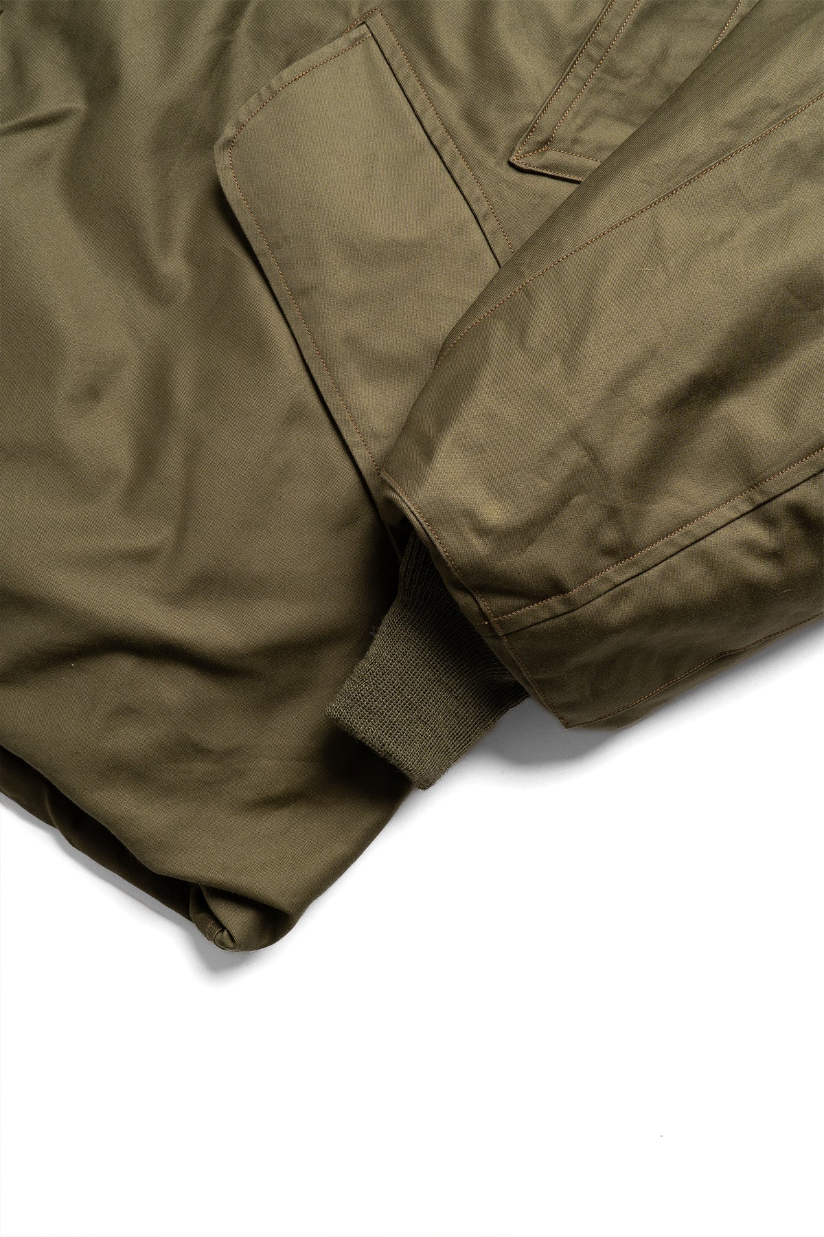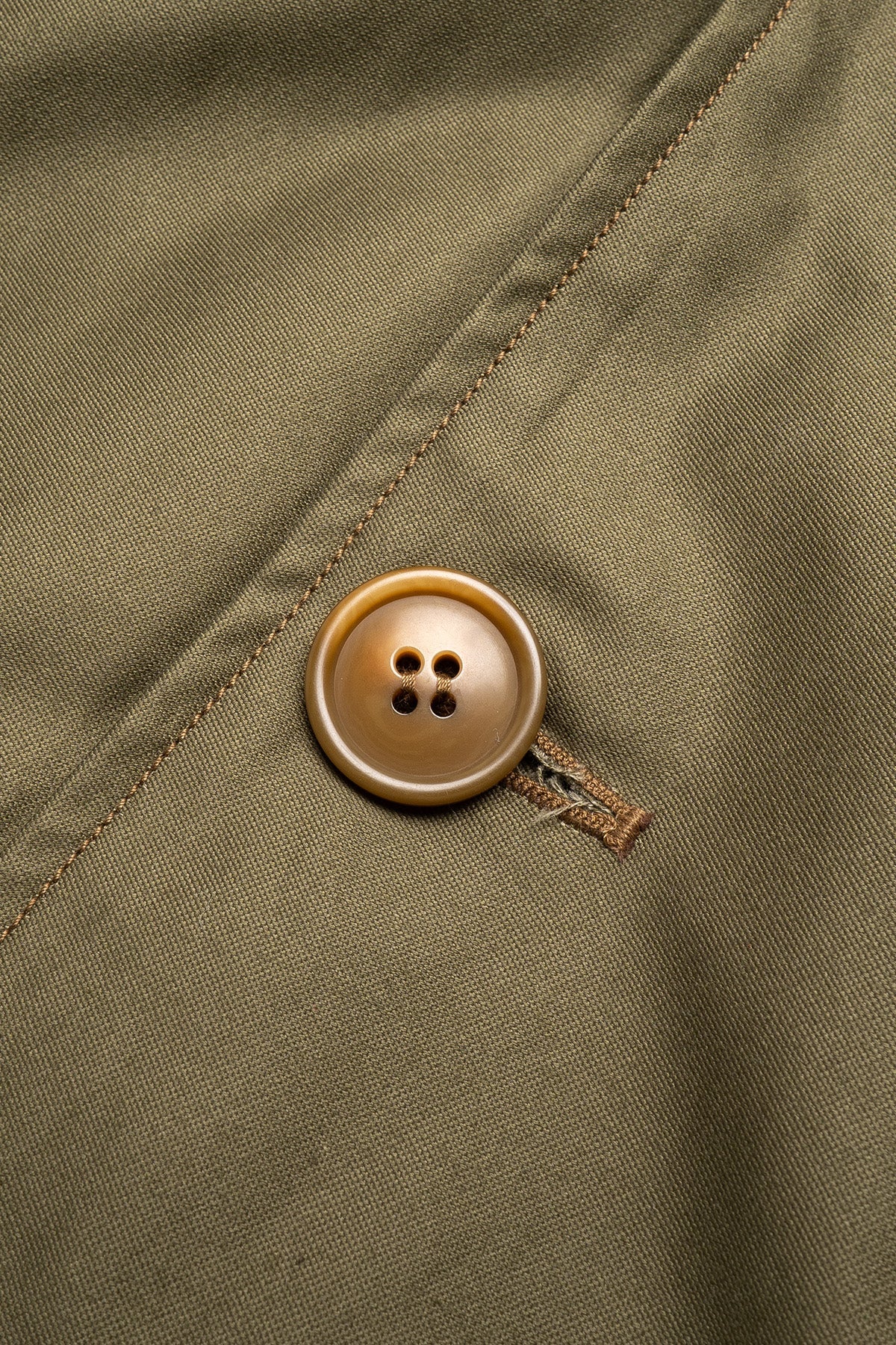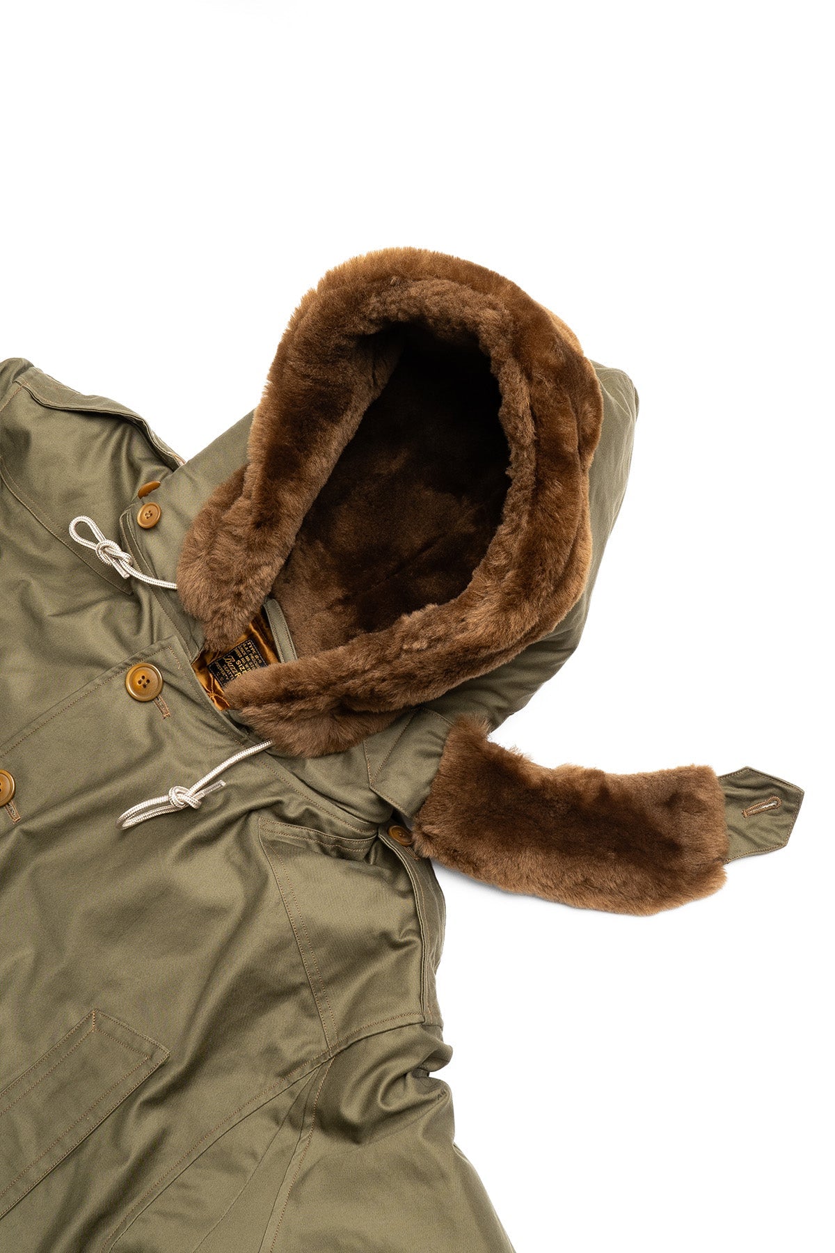 This parka features a multi-layer construction consisting of an outer shell and a down-filled lining. The outer shell is made from 100% cotton soft twill fabric in olive drab. The lining is crafted from 100% cupro satin quilted fabric, filled with 90% down and 10% feathers, providing exceptional warmth and a smooth, comfortable feel.