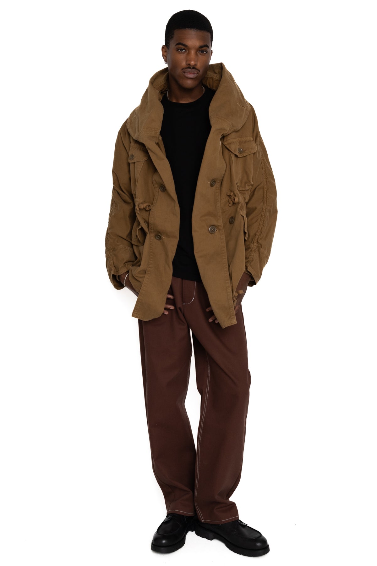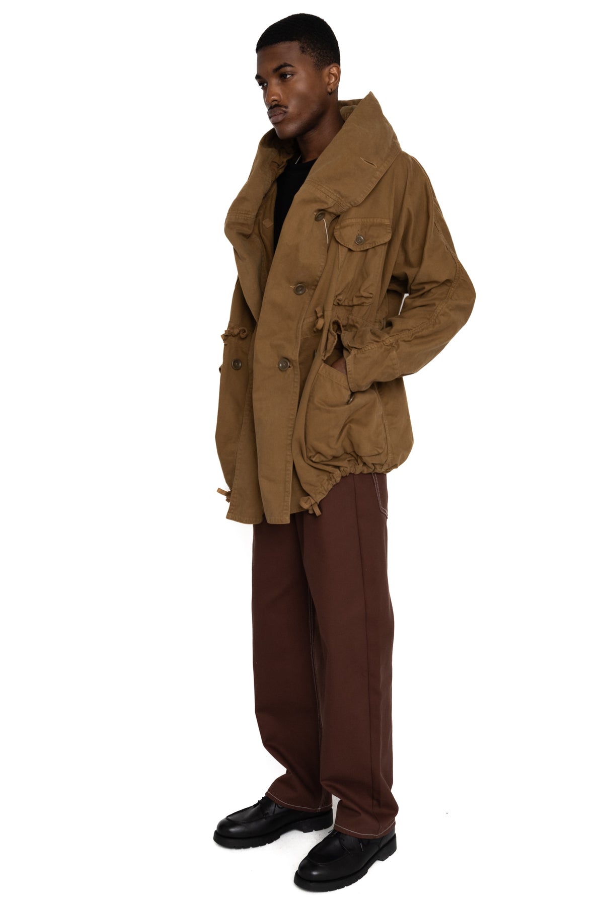 A coat that you can enjoy various ways of wearing with many buttons and front bibs