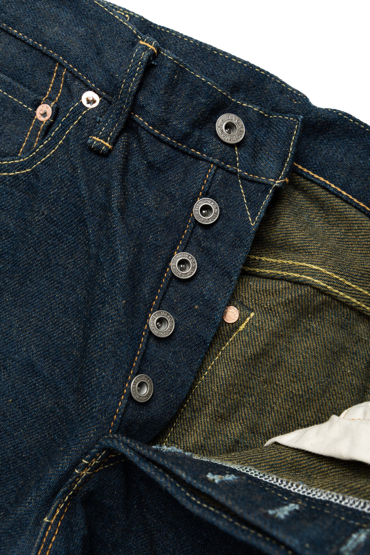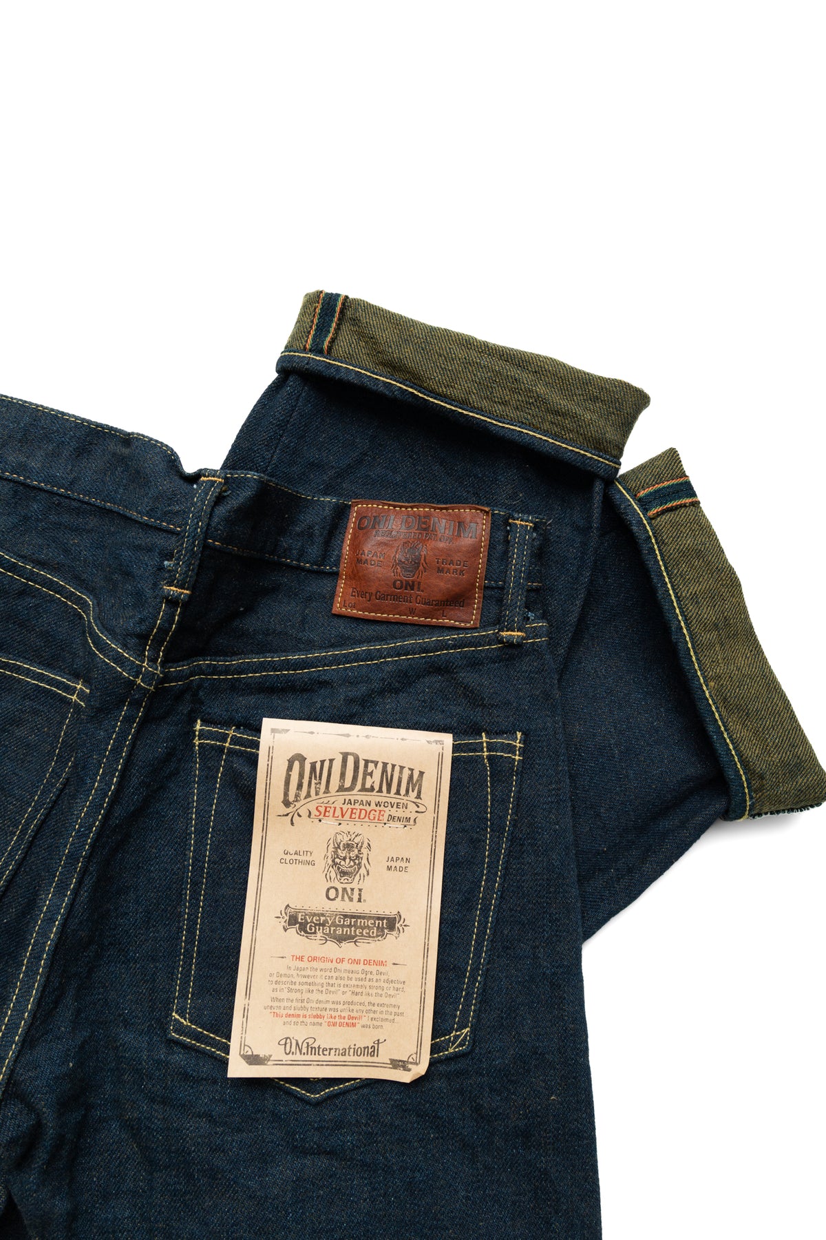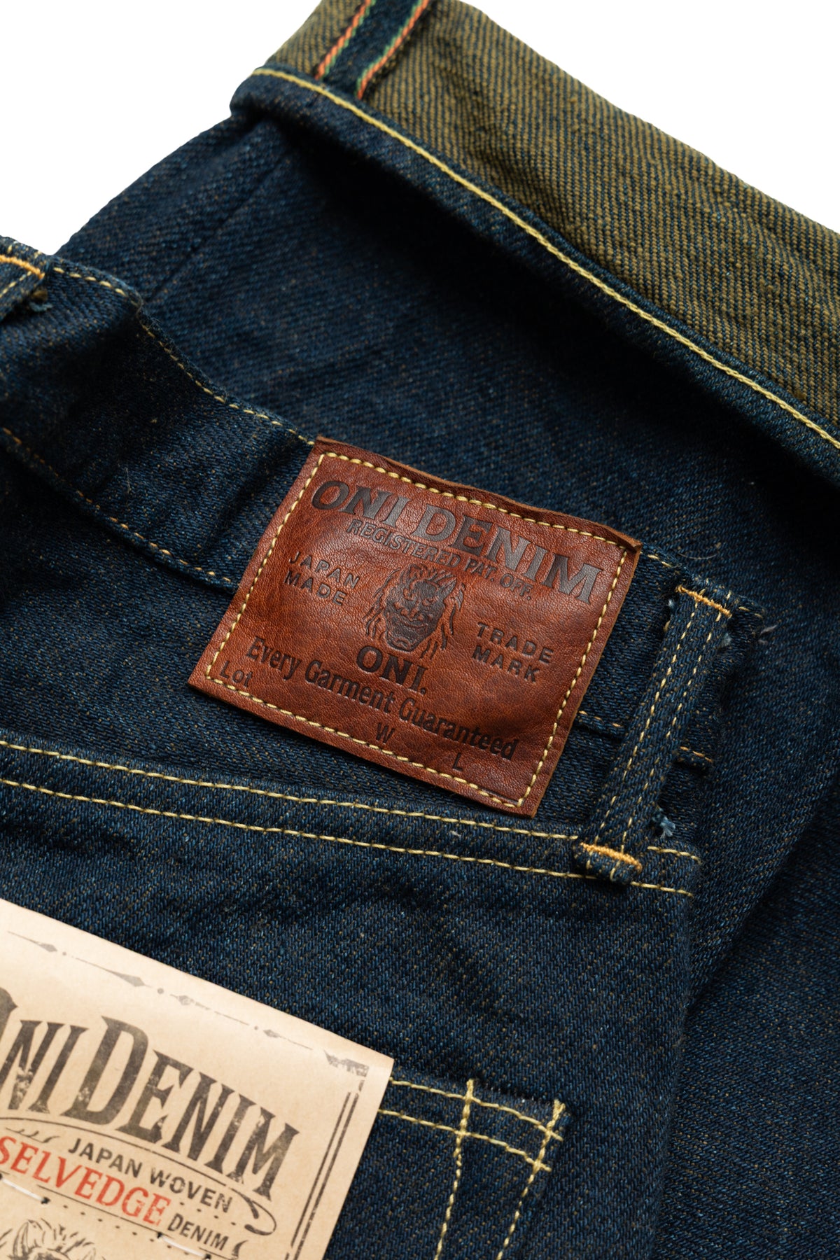 ONI's specially developed Secret Denim features warp yarns that are rope dyed leaving the cores undyed to give way to contrast fading, and weft yarns that are dyed Beige for a color reminiscent of cotton found growing in the wild. This gives the denim a rustic dark color while still maintaining a vibrant indigo blue. This particular model uses an indigo dye with a Green Cast which fades to light blue with greenish hue. The low tension weave gives this heavy denim a soft hand with an irregular and slubby texture. There are many other intricacies to this denim that need to be seen and felt in person to fully appreciate and most of the special techniques involved with creating it's unique look, texture and feel are held secret, hence the name “Secret Denim”.
