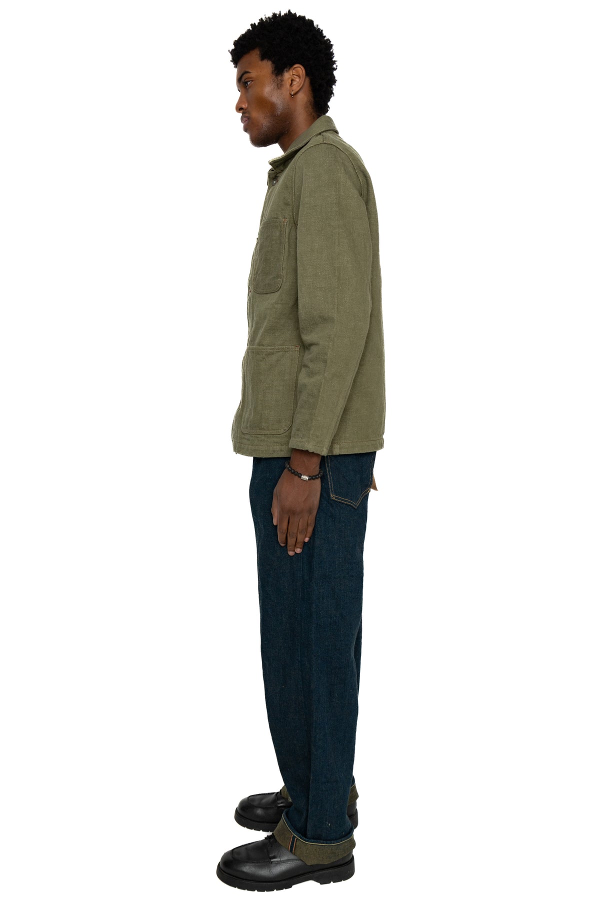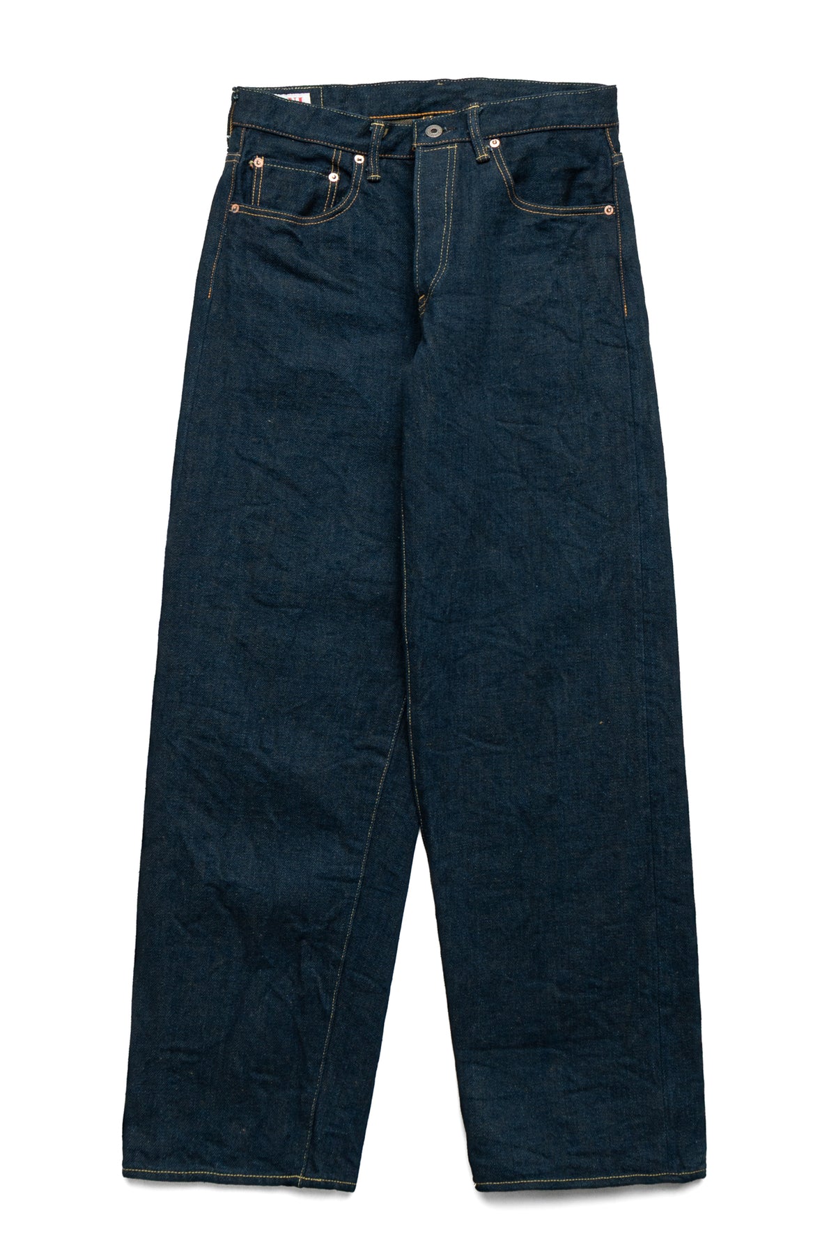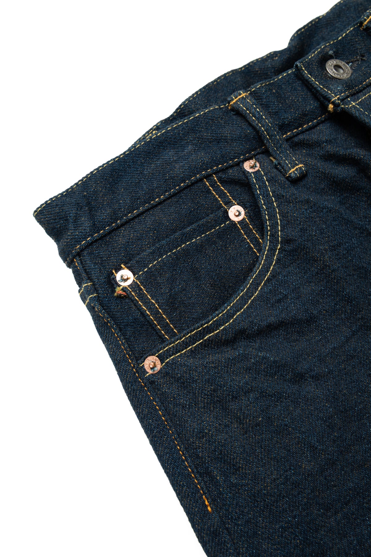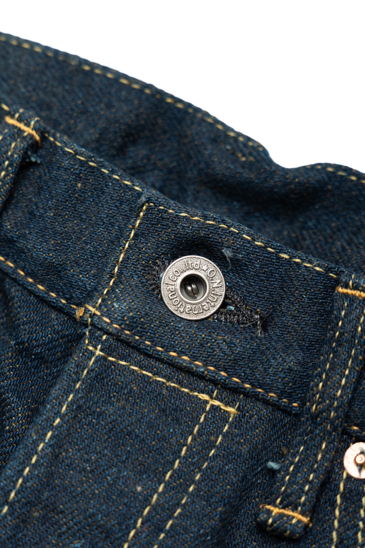 ONI's specially developed Secret Denim features warp yarns that are rope dyed leaving the cores undyed to give way to contrast fading, and weft yarns that are dyed Beige for a color reminiscent of cotton found growing in the wild. This gives the denim a rustic dark color while still maintaining a vibrant indigo blue. This particular model uses an indigo dye with a Green Cast which fades to light blue with greenish hue. The low tension weave gives this heavy denim a soft hand with an irregular and slubby texture. There are many other intricacies to this denim that need to be seen and felt in person to fully appreciate and most of the special techniques involved with creating it's unique look, texture and feel are held secret, hence the name “Secret Denim”.