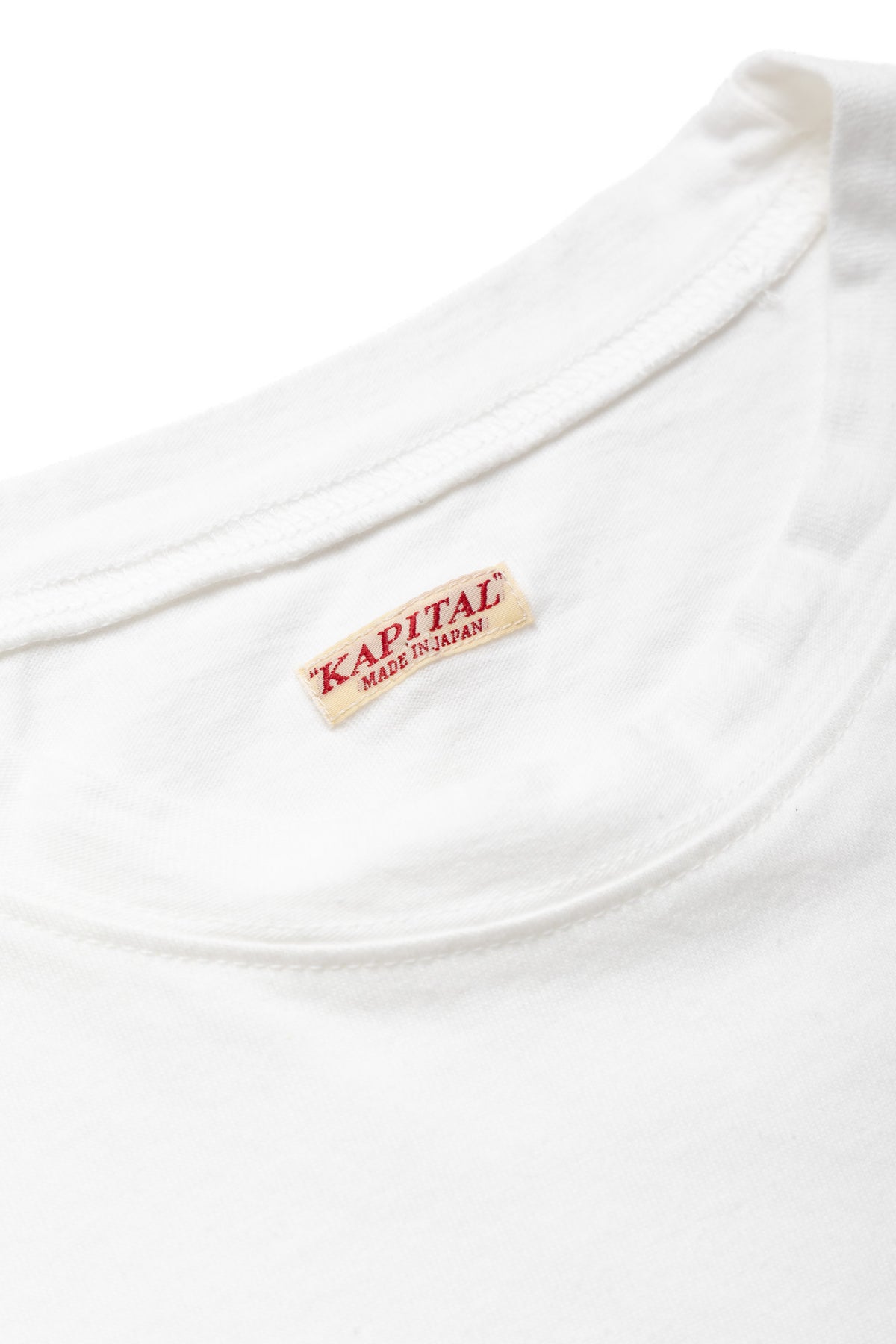 T-shirt features the "KAP][TAL" logo, which is used on the leather patch of KAPITAL jeans, printed on the front.