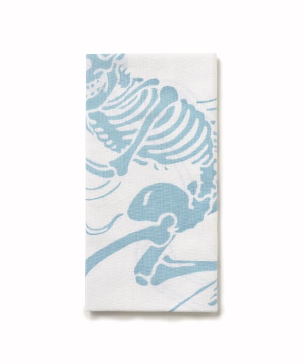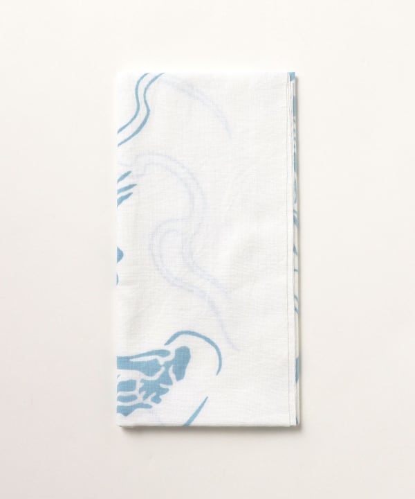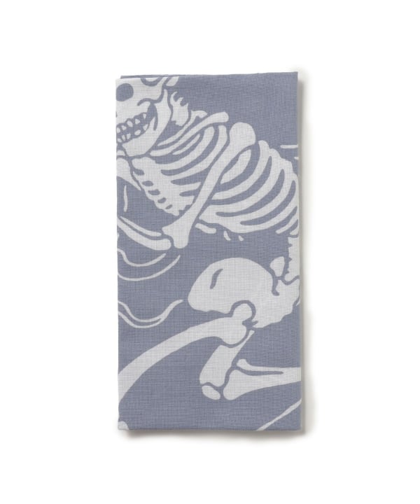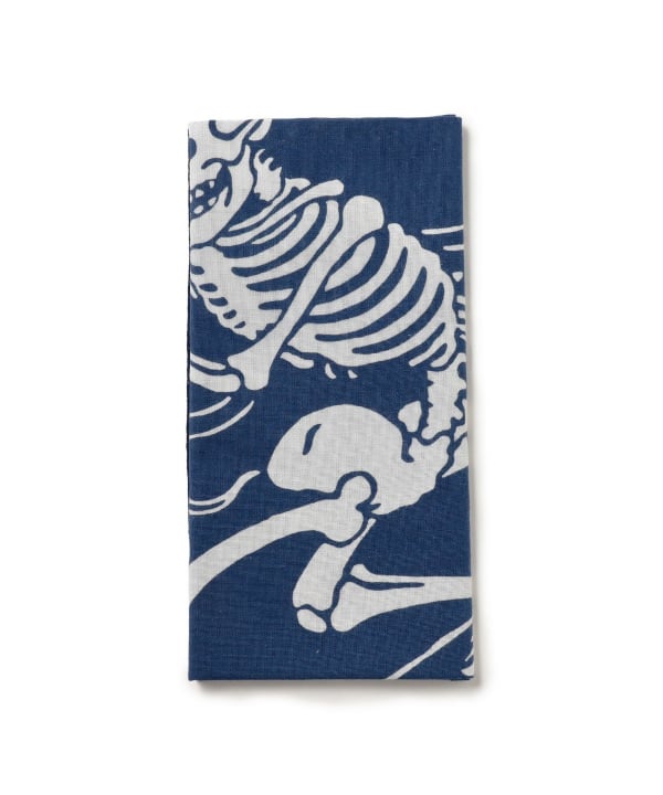 This tenugui (Japanese hand towel) features a distinctive skull design by Toshikazu Nosaka. It is dyed using the Chusen dyeing technique.