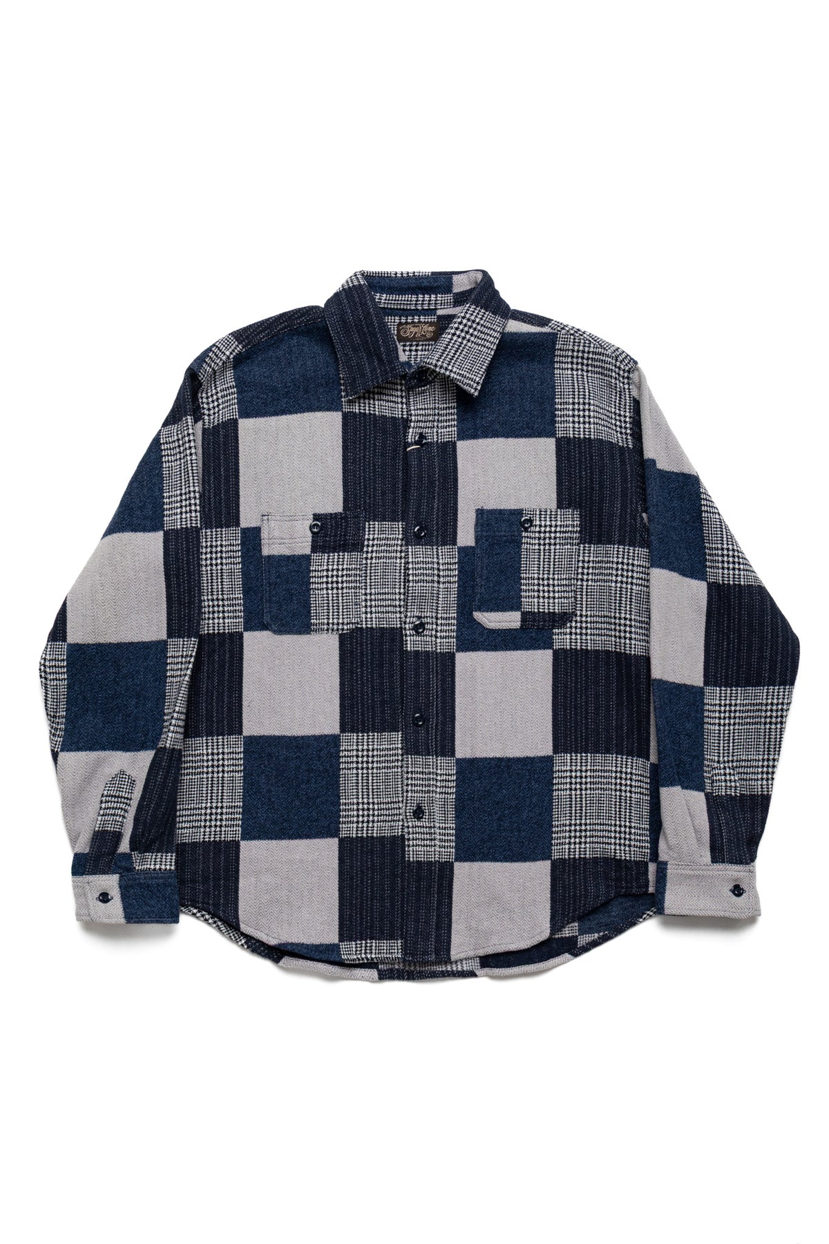 A work shirt made in a patchwork style by double weaving instead of sewing check fabrics together