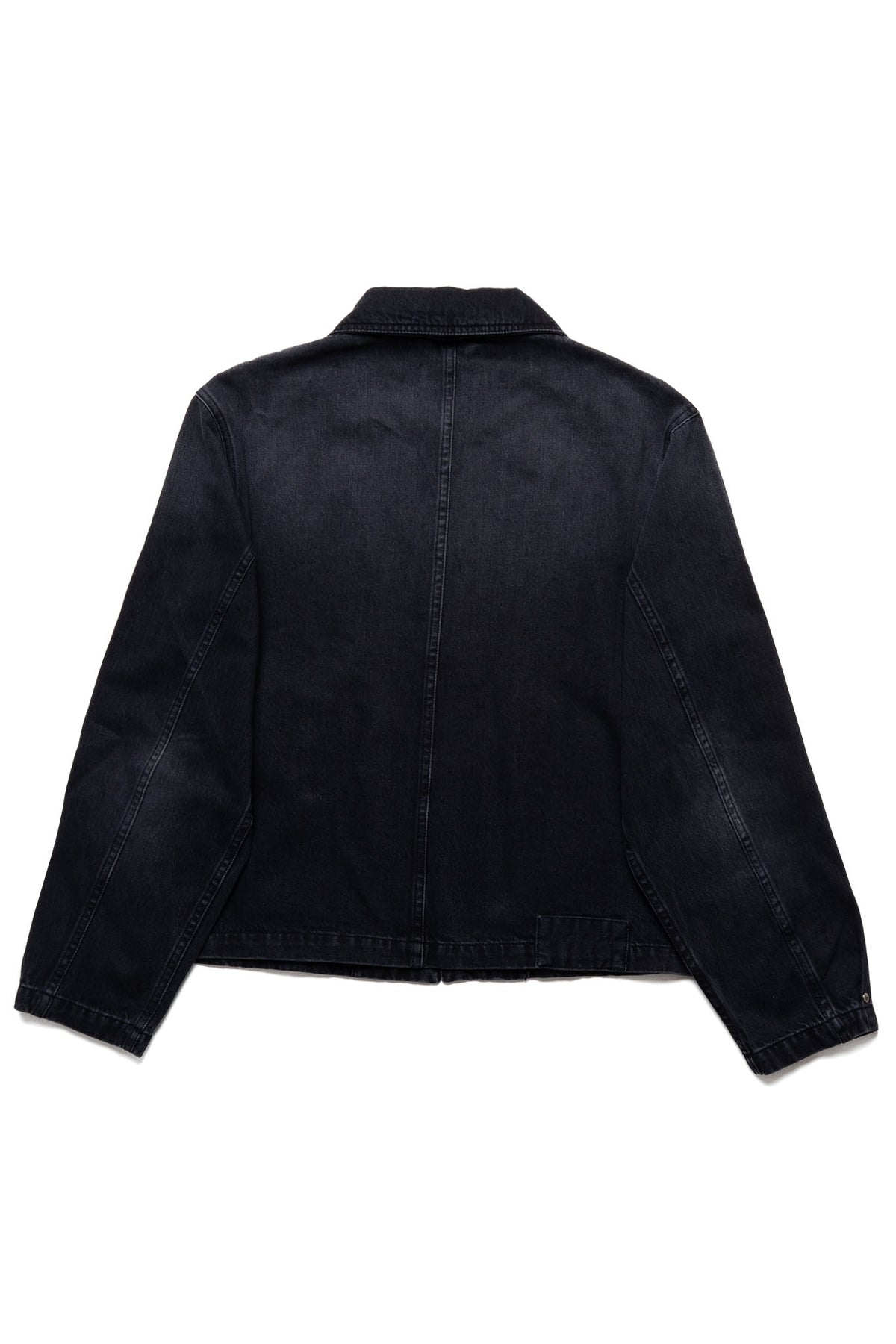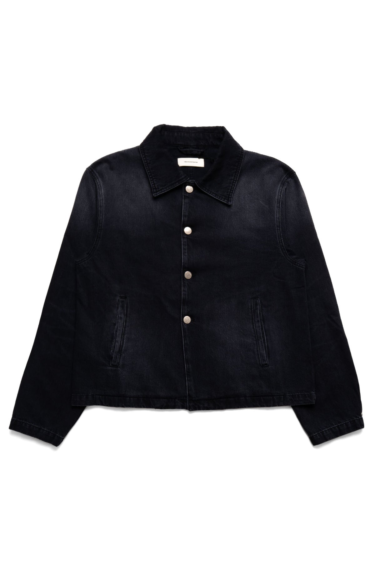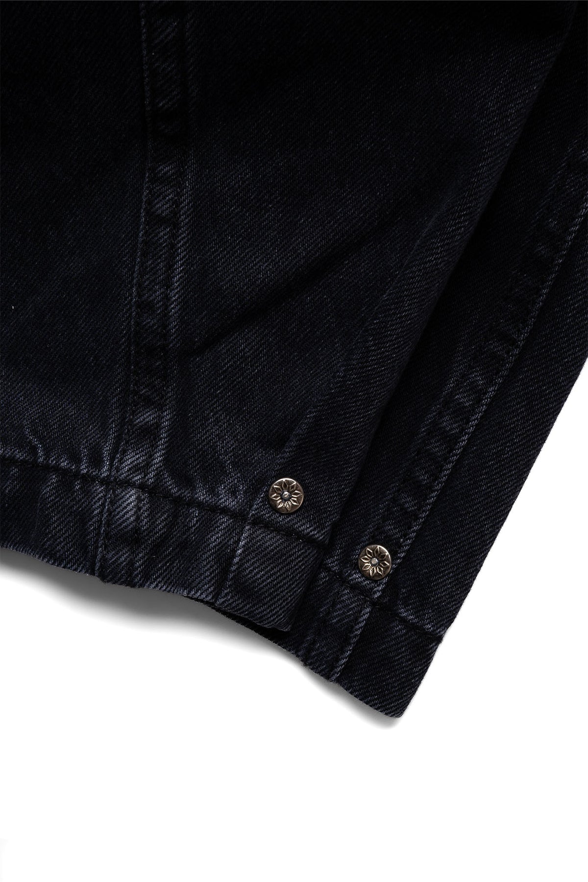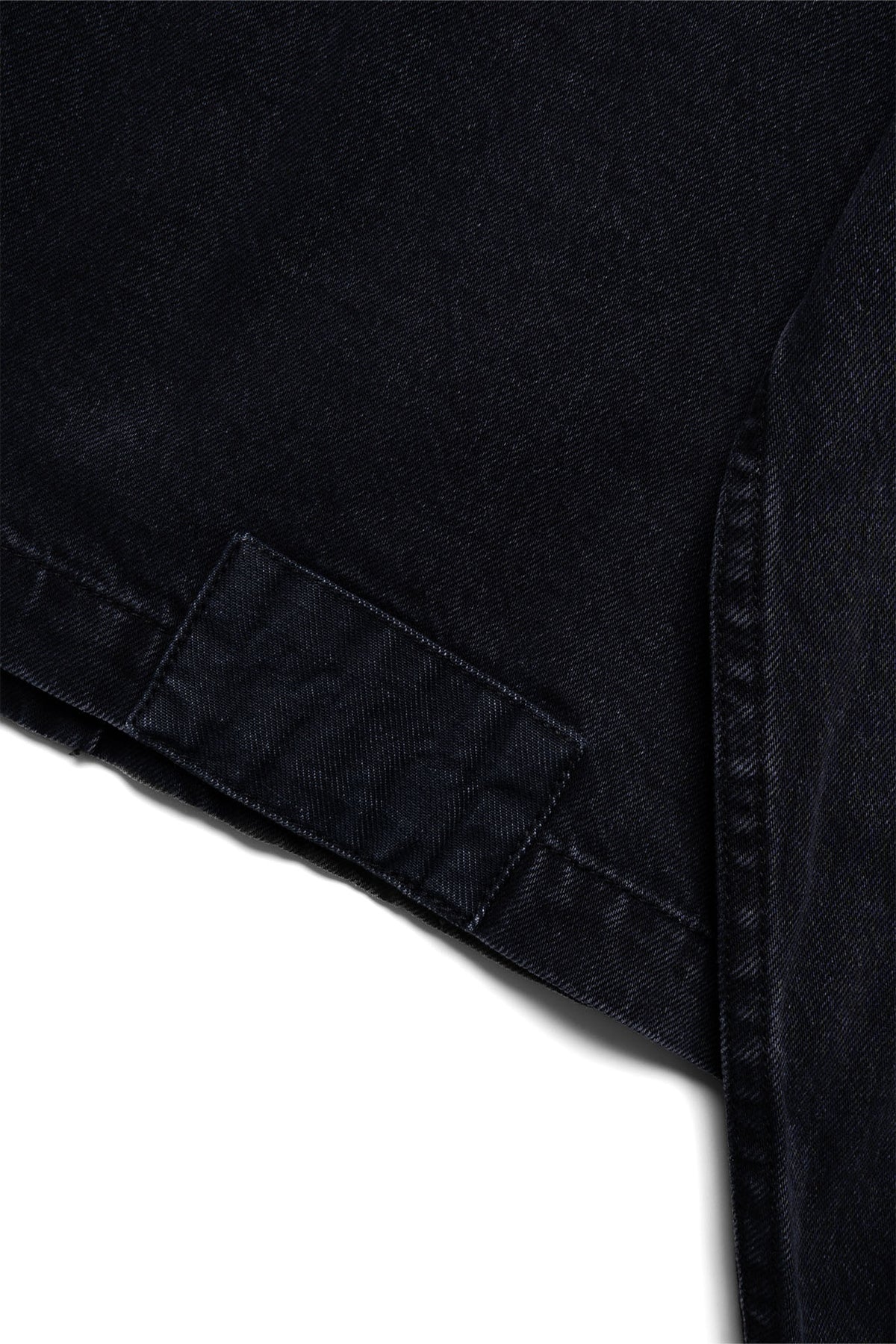 The Union Jacket has a relaxed fit with drop shoulders. Featuring spread collar, side welt pockets, metal button closure and flower rivets at sleeves and side seams. Cut from a garment washed organic cotton denim with a dry hand feel in faded black.