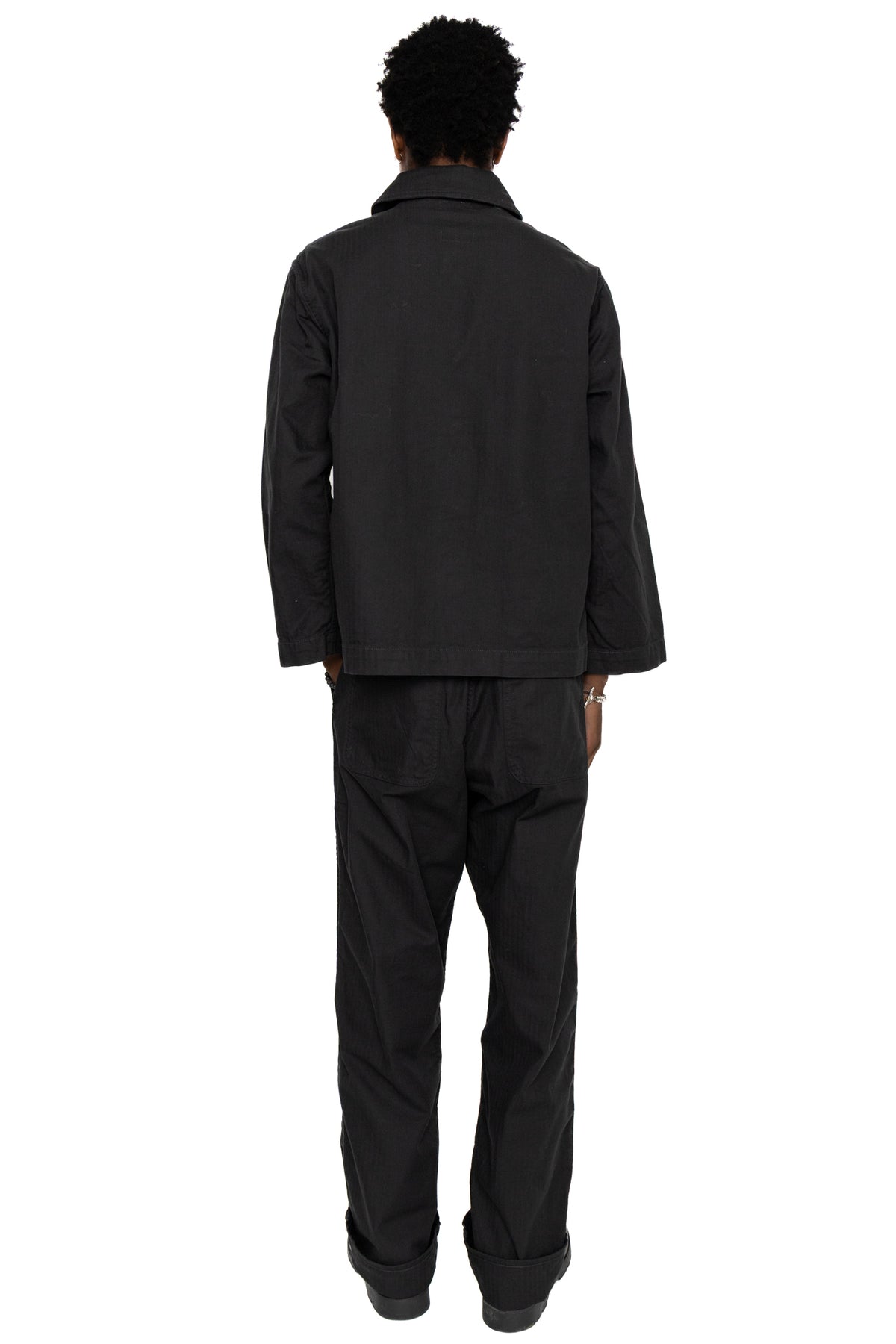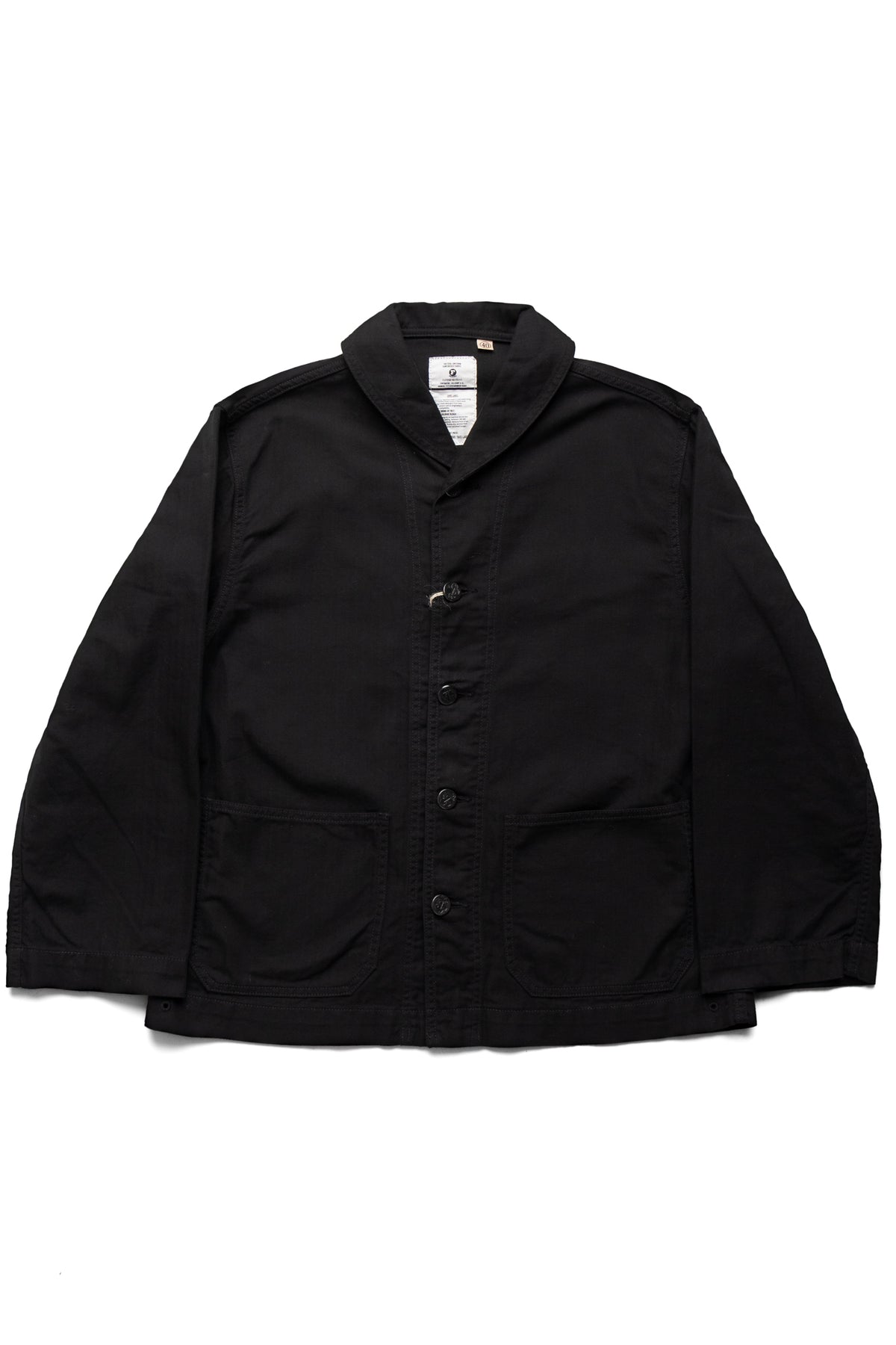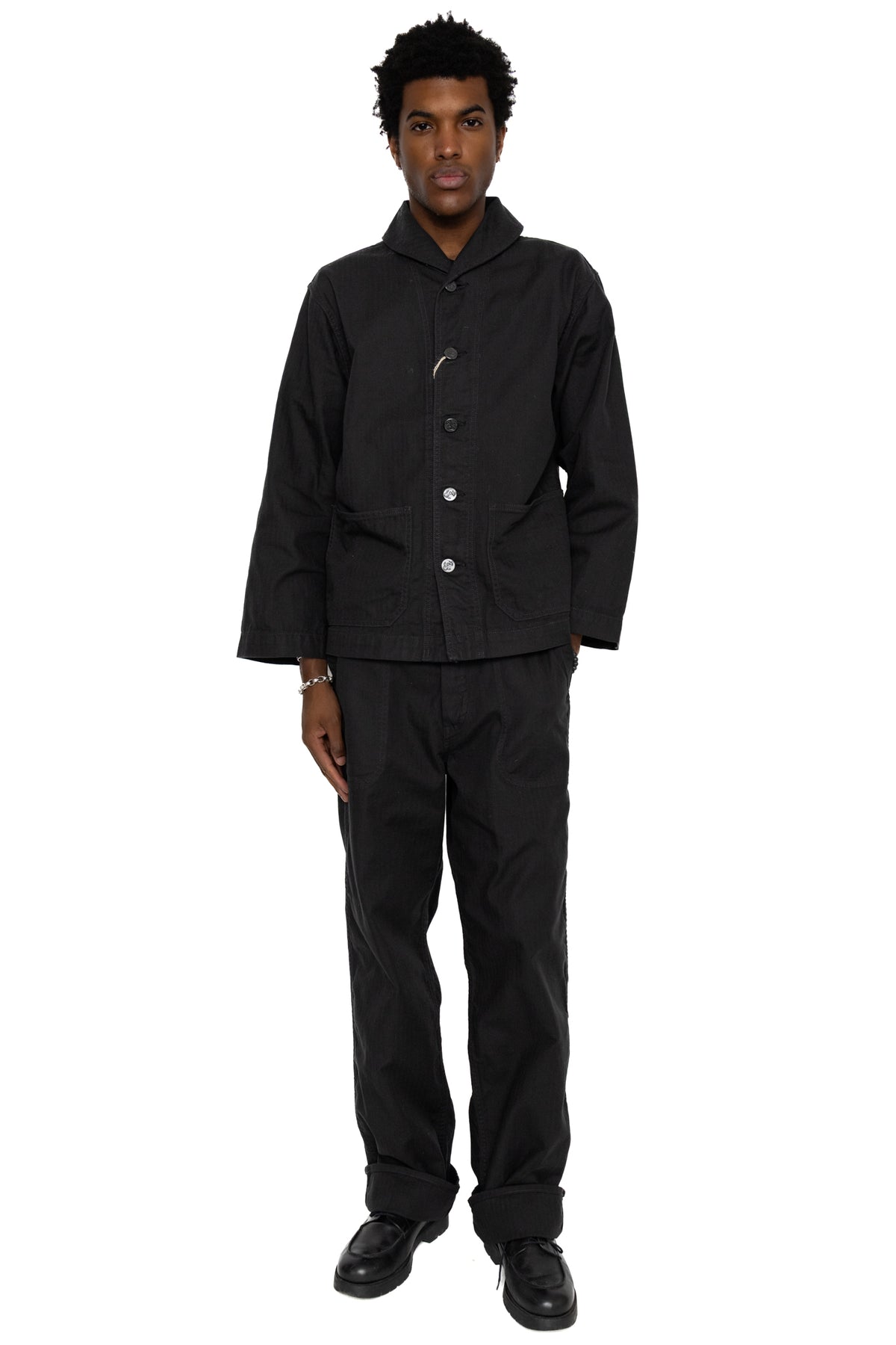 • A shawl-collar coverall crafted from military-style herringbone fabric woven with 10-count yarn.