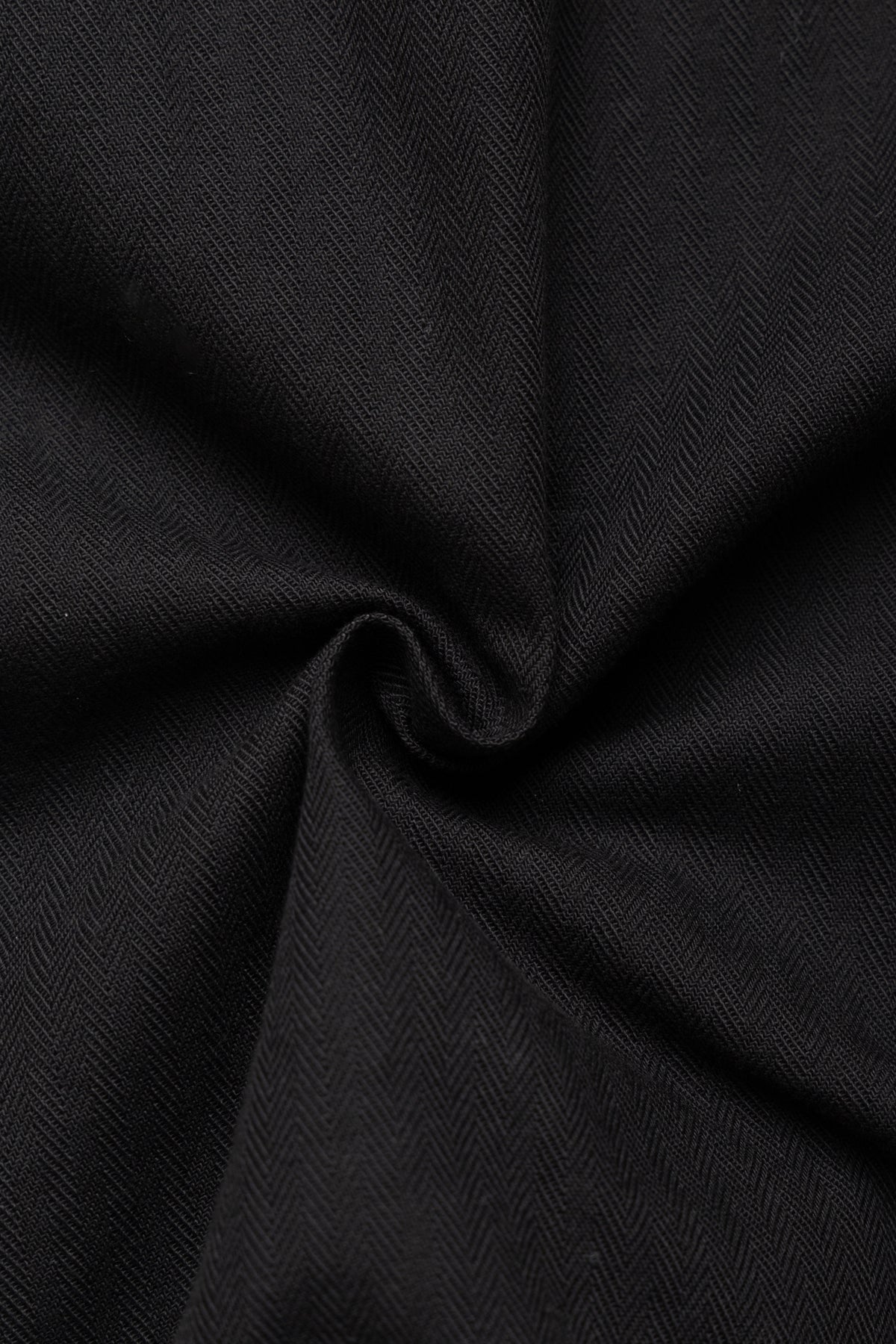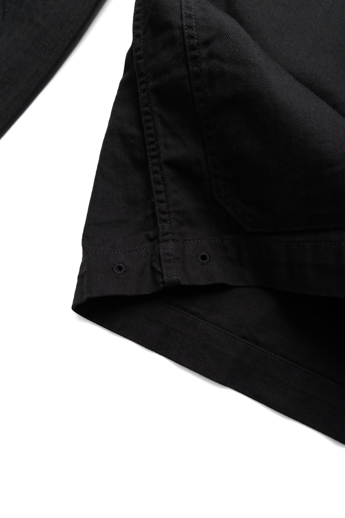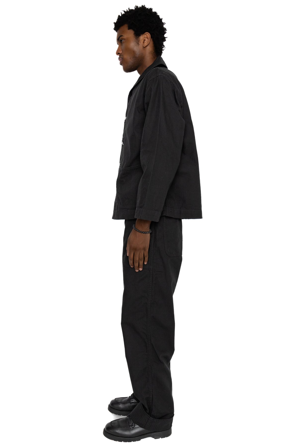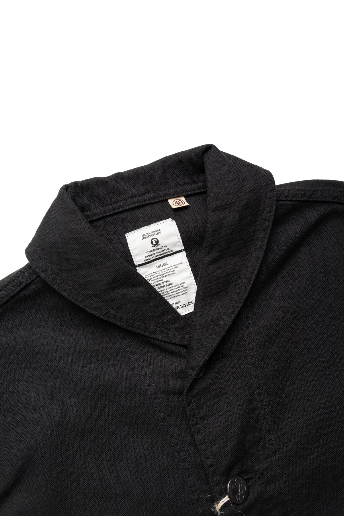 • A shawl-collar coverall crafted from military-style herringbone fabric woven with 10-count yarn.
