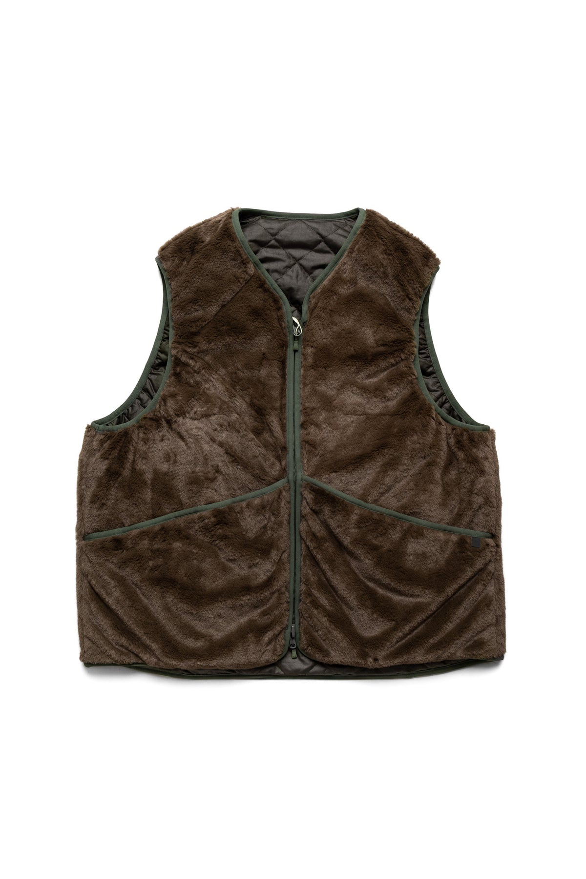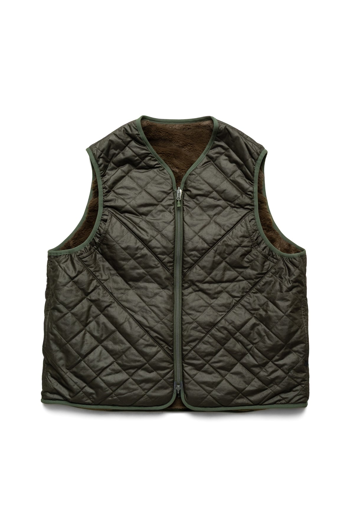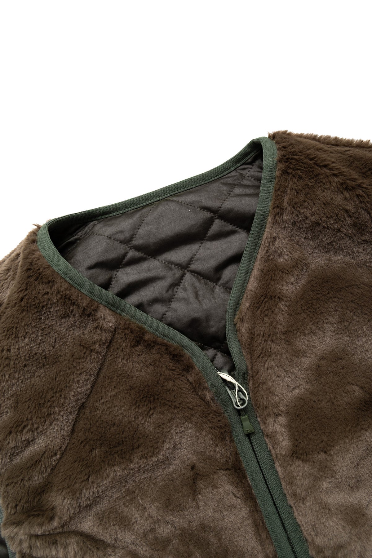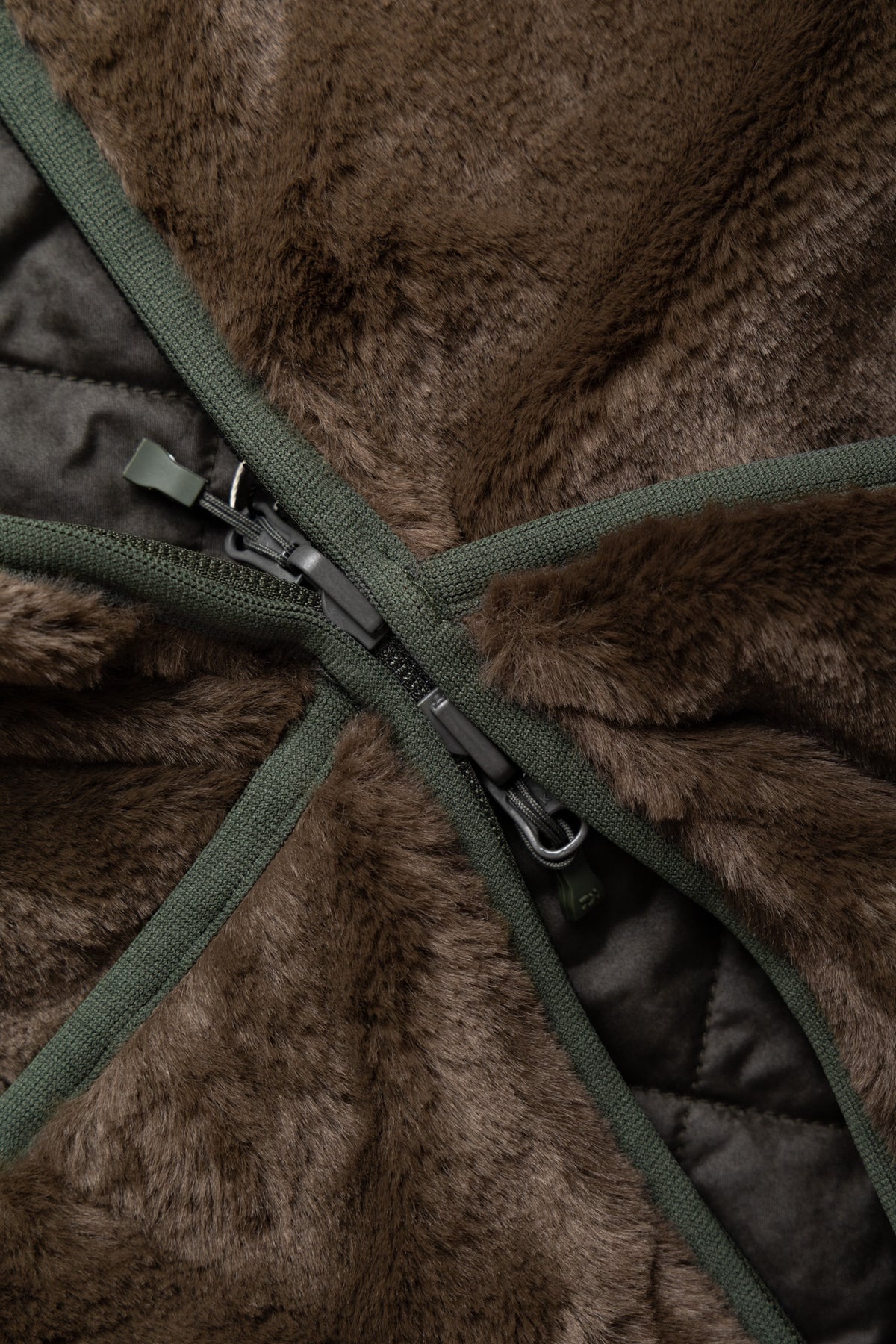 - One side features long-haired faux fur, while the other features diamond-patterned quilting for a British feel.
