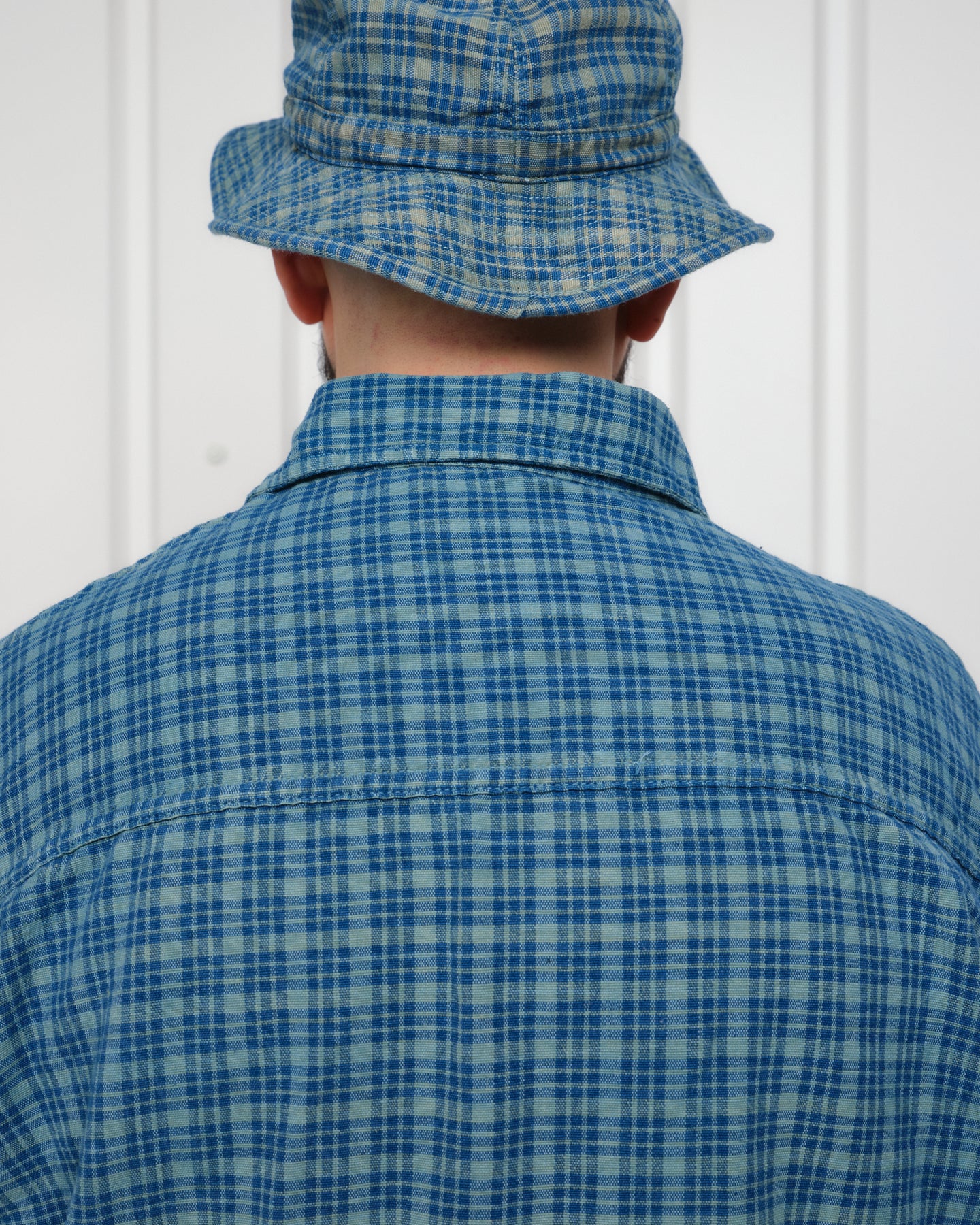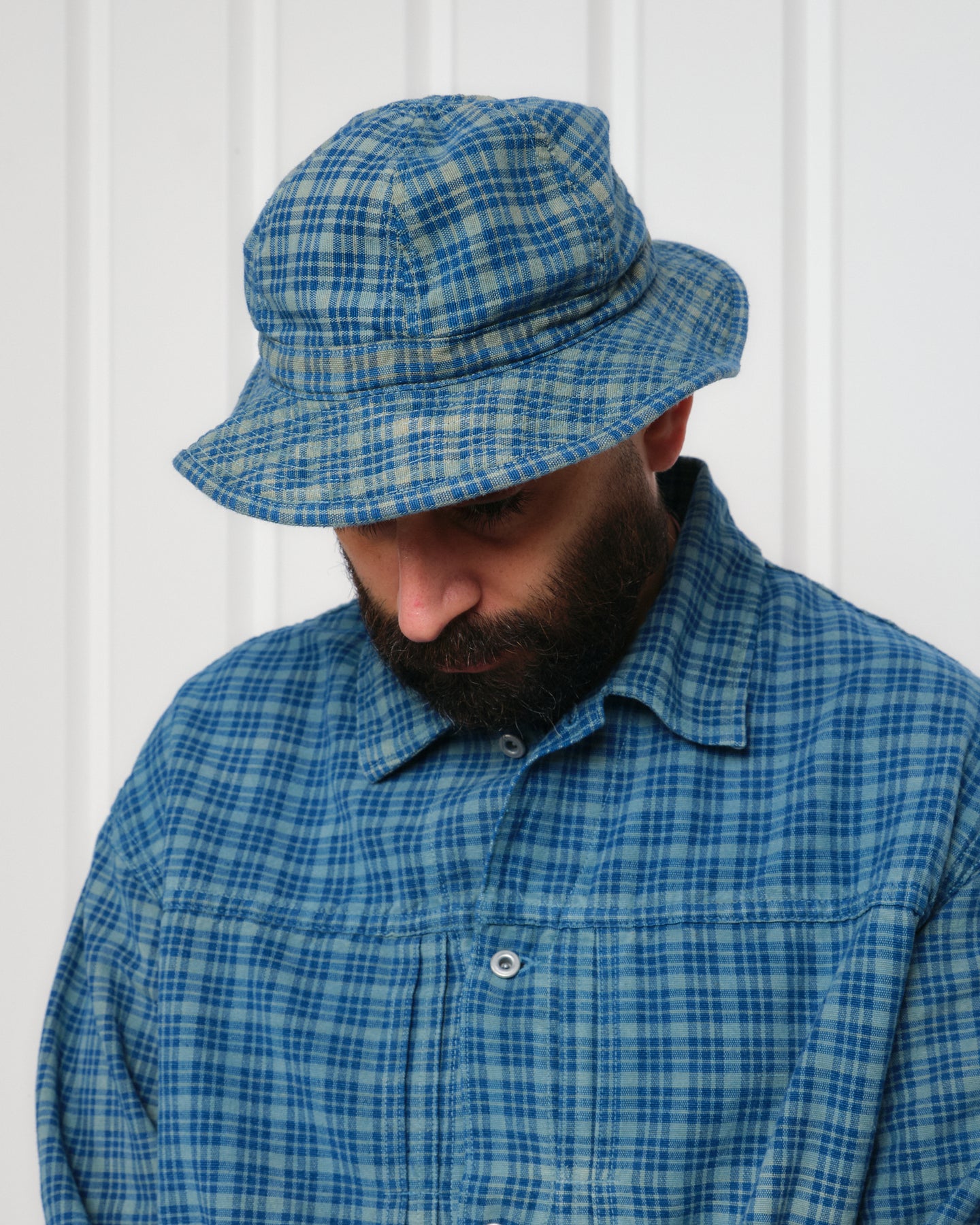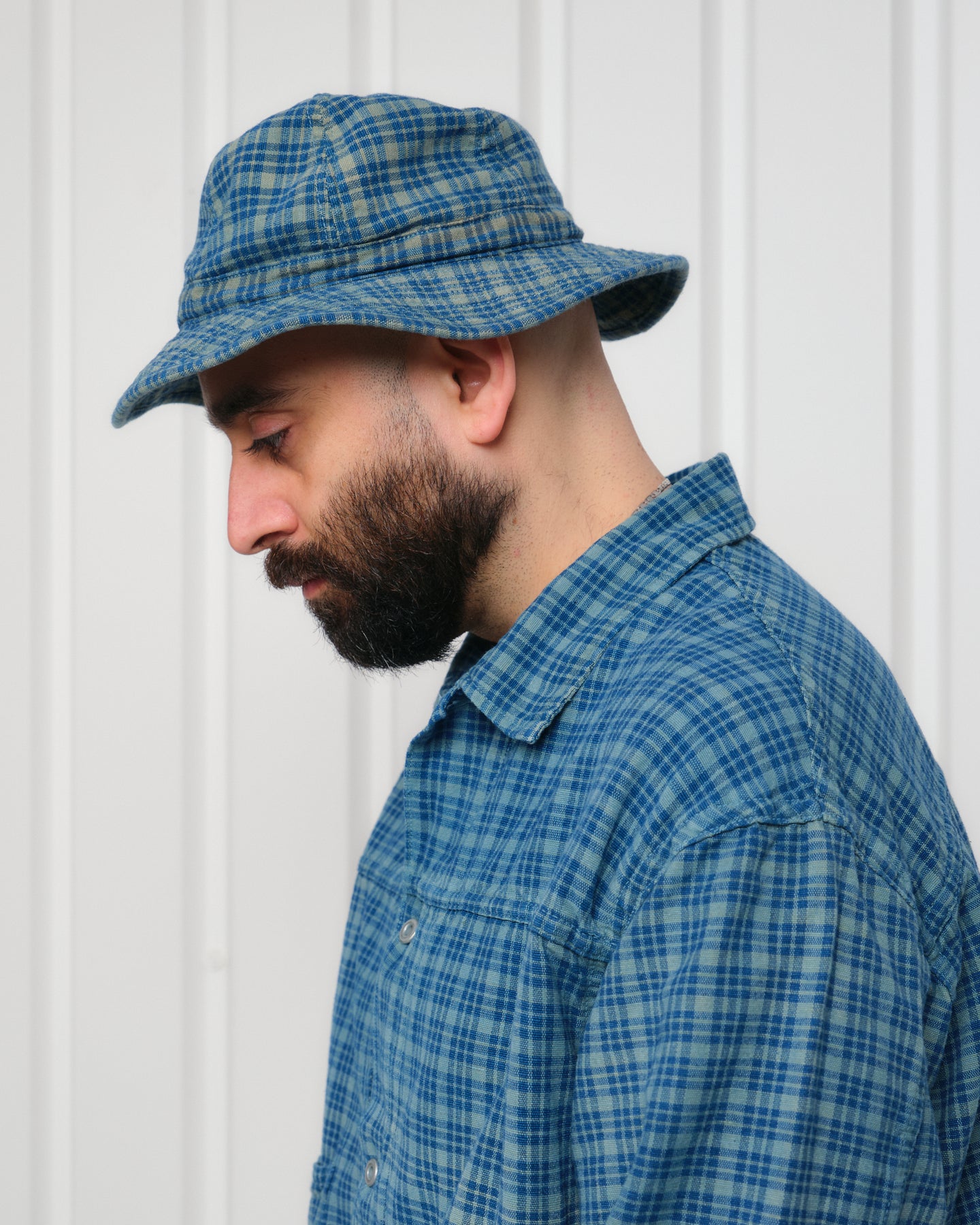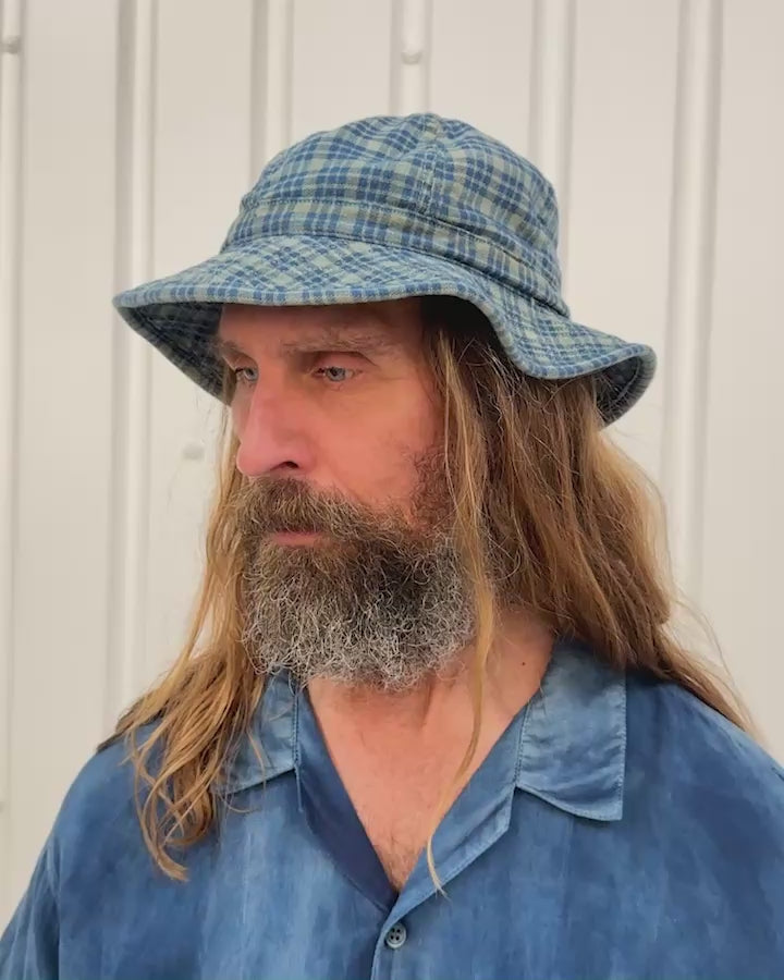 Based on a vintage hit, the Daisy Mae Hat features a 6 panel construction with a wide floppy brim. The bucket hat is made using handwoven check fabric in Thailand that is then naturally dyed with indigo.
