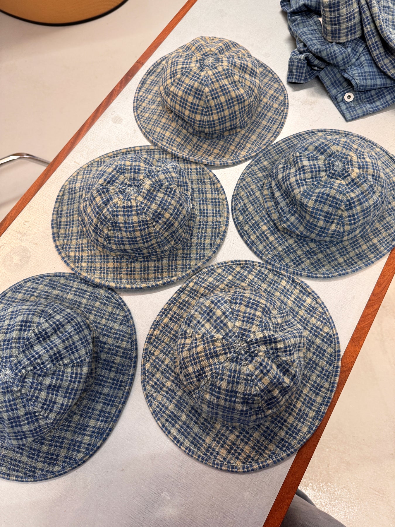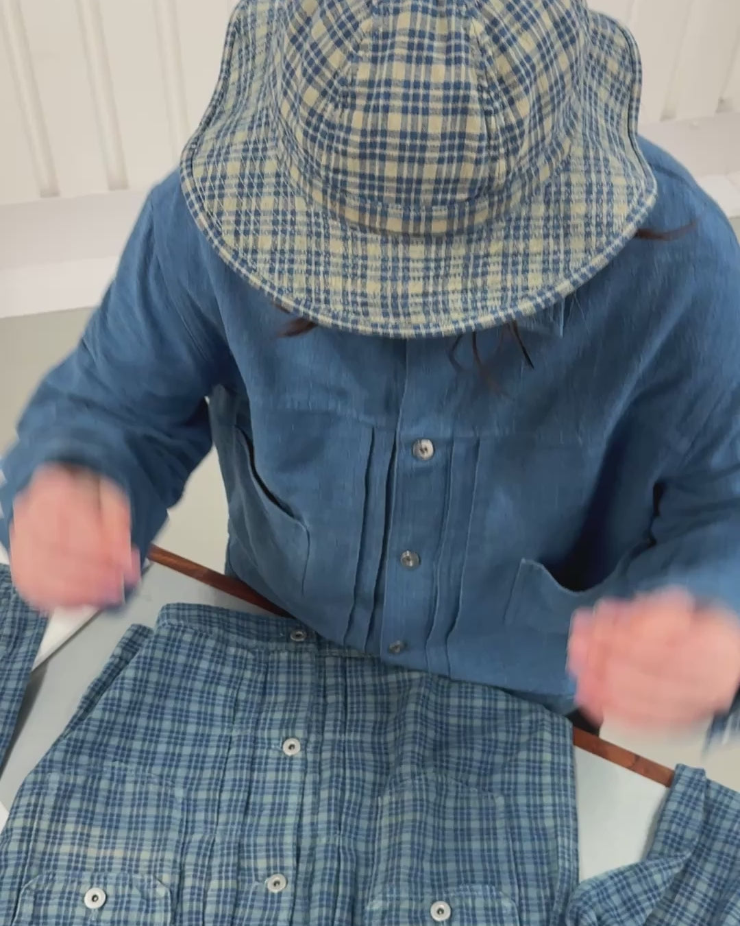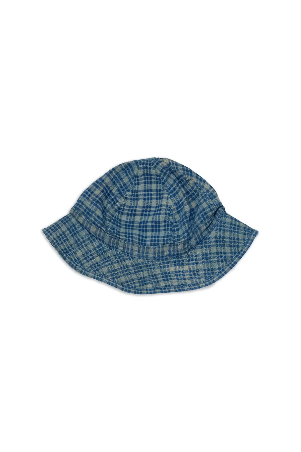 Based on a vintage hit, the Daisy Mae Hat features a 6 panel construction with a wide floppy brim. The bucket hat is made using handwoven check fabric in Thailand that is then naturally dyed with indigo.
