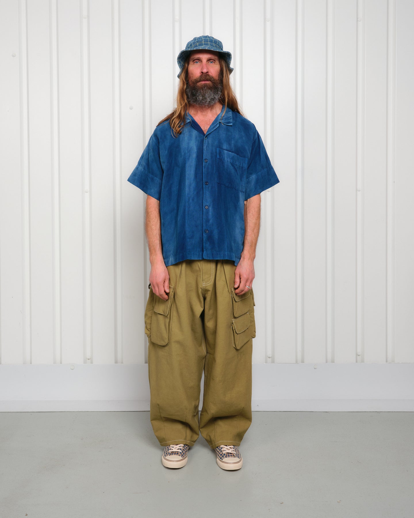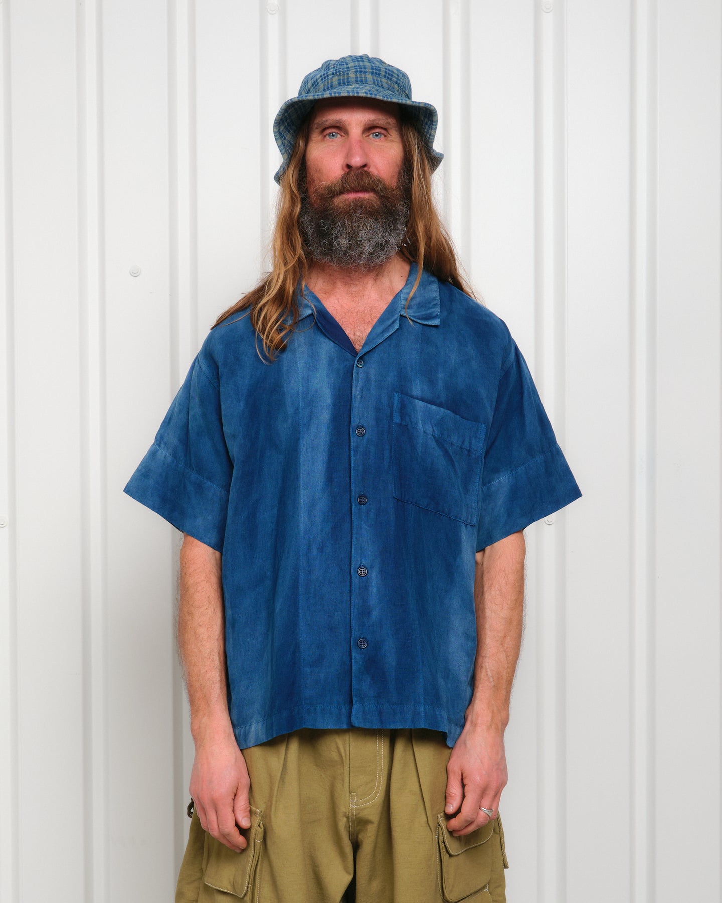 Each piece has been overdyed in natural indigo, creating a rich, translucent indigo layer. Natural indigo works more like a coating than a synthetic dye, it sits on the surface of the garment and evolves beautifully with wear.