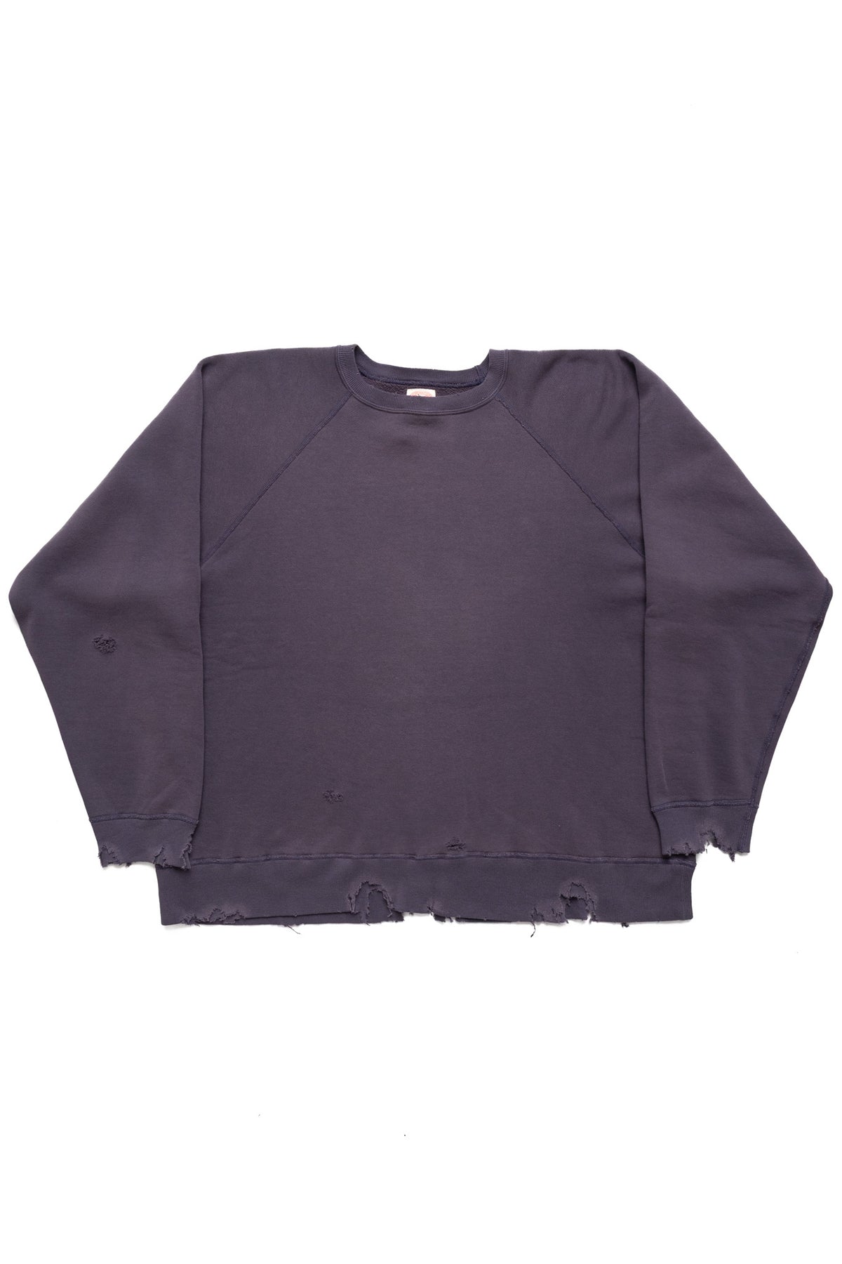 - A flat-seam raglan sweatshirt with a 60s-inspired sun-faded and distressed look.
